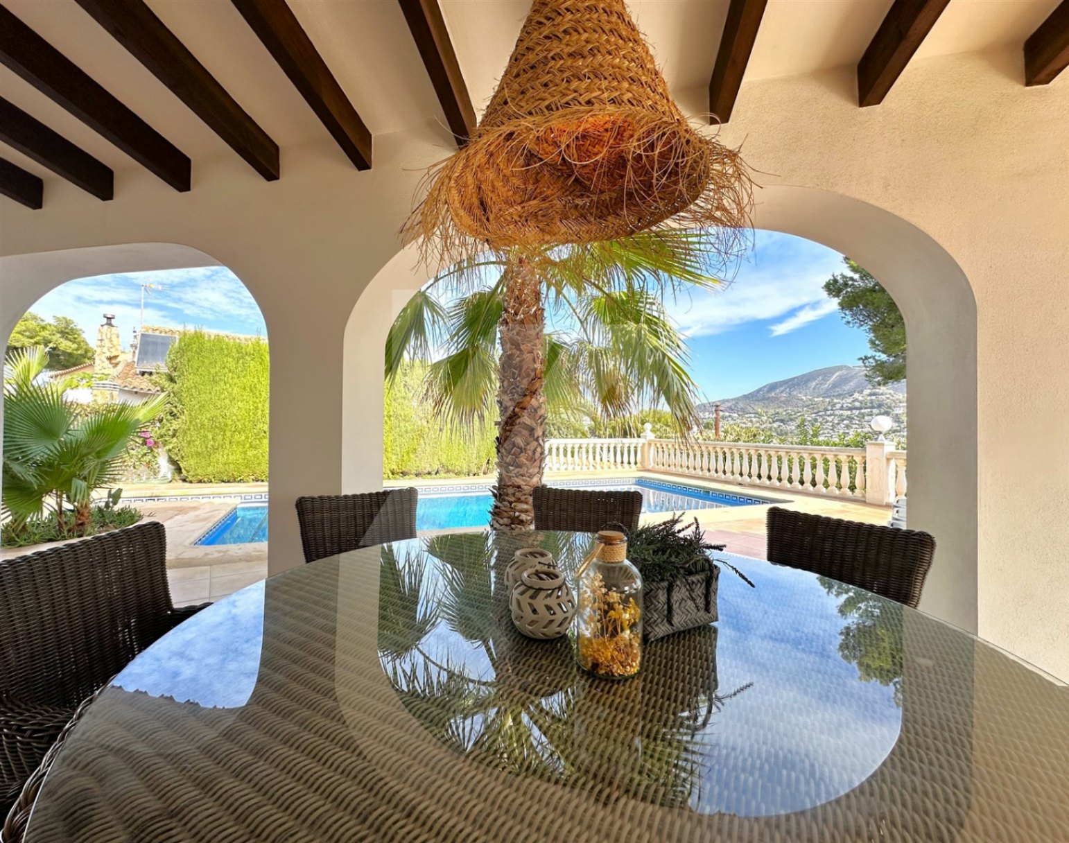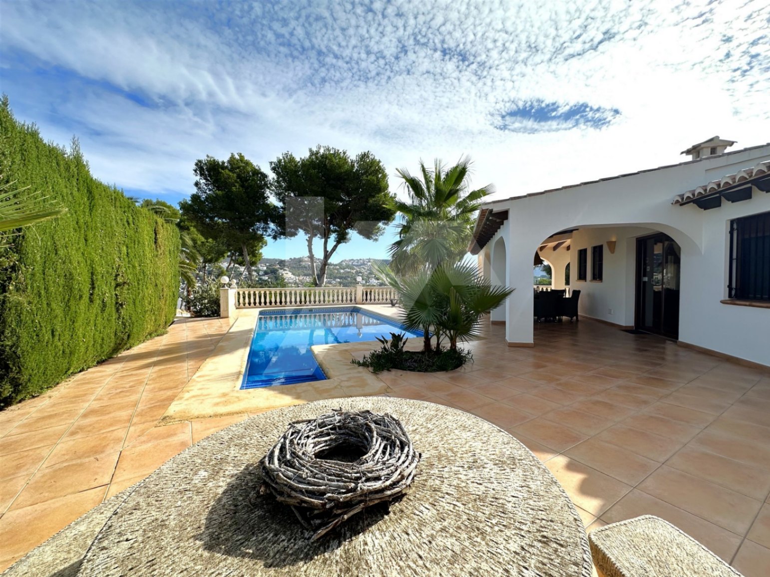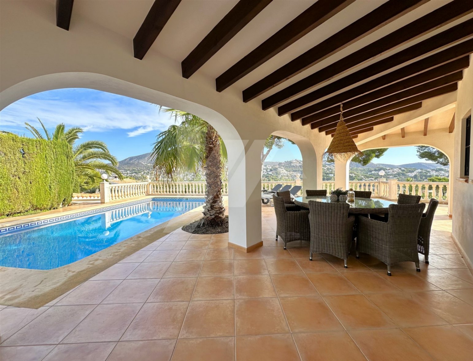 En el exterior destaca una gran terraza parcialmente cubierta, para poder disfrutar del sol en invierno y de la sombra en verano, y una preciosa piscina con vistas abiertas a Benitachell y Moraira. En la terraza encontramos también un aseo y una ducha exterior, para mayor comodidad de los usuarios.