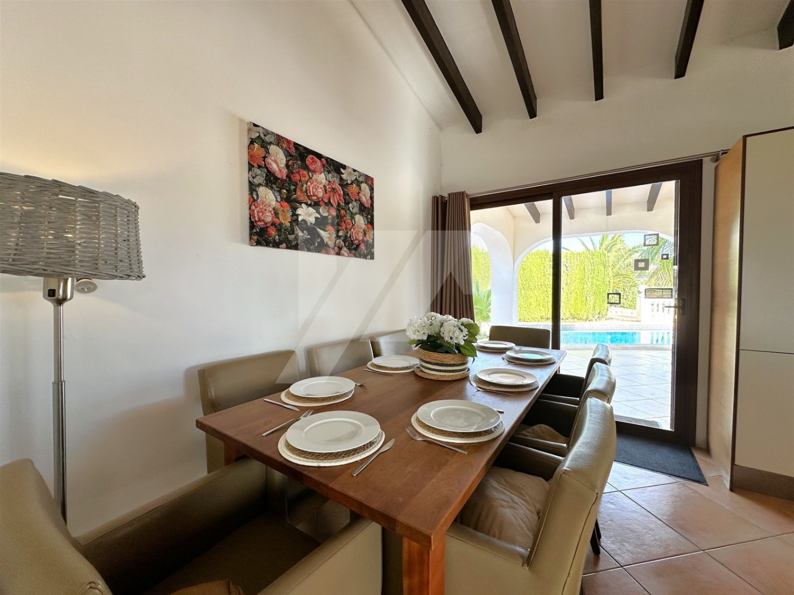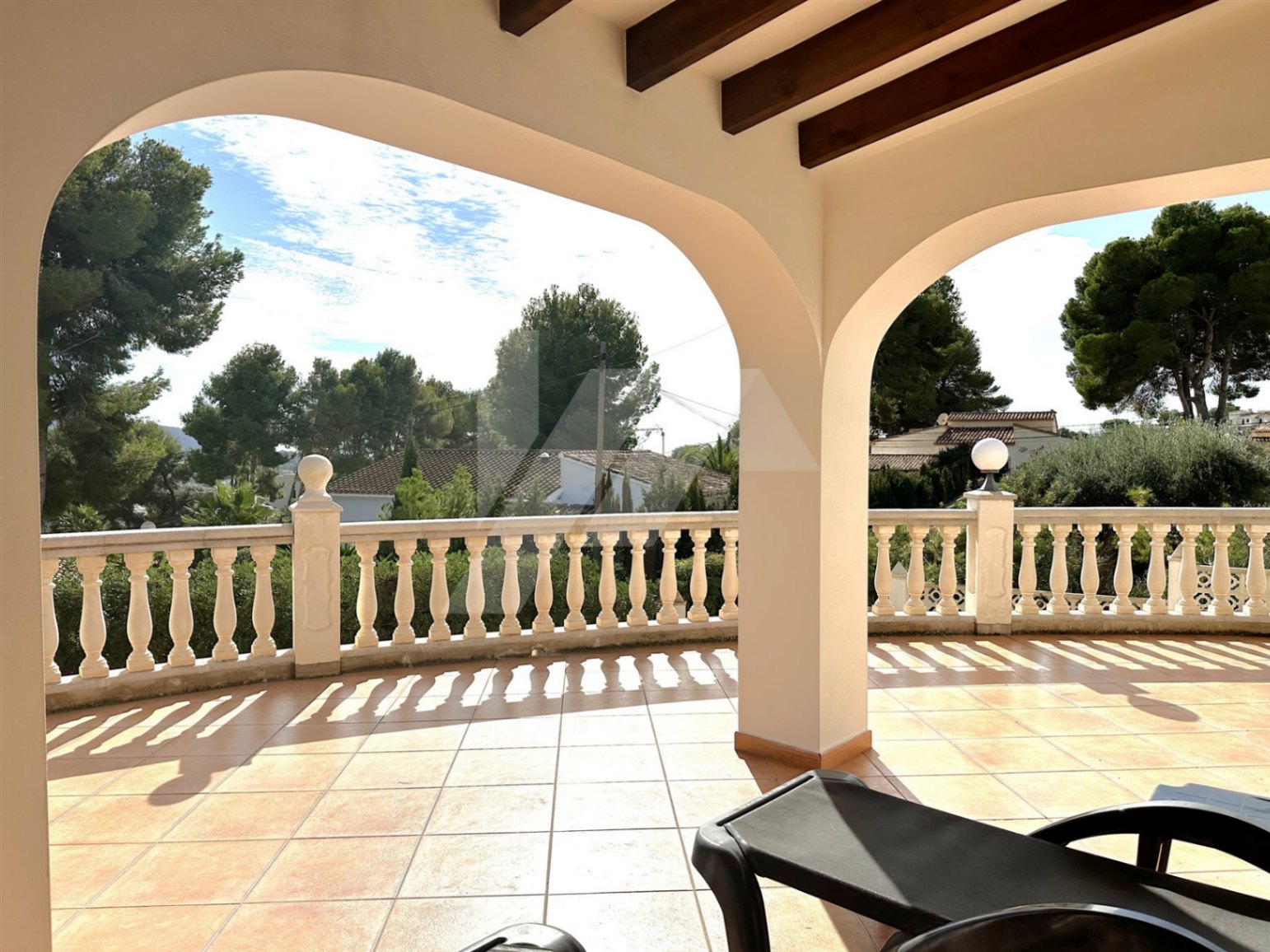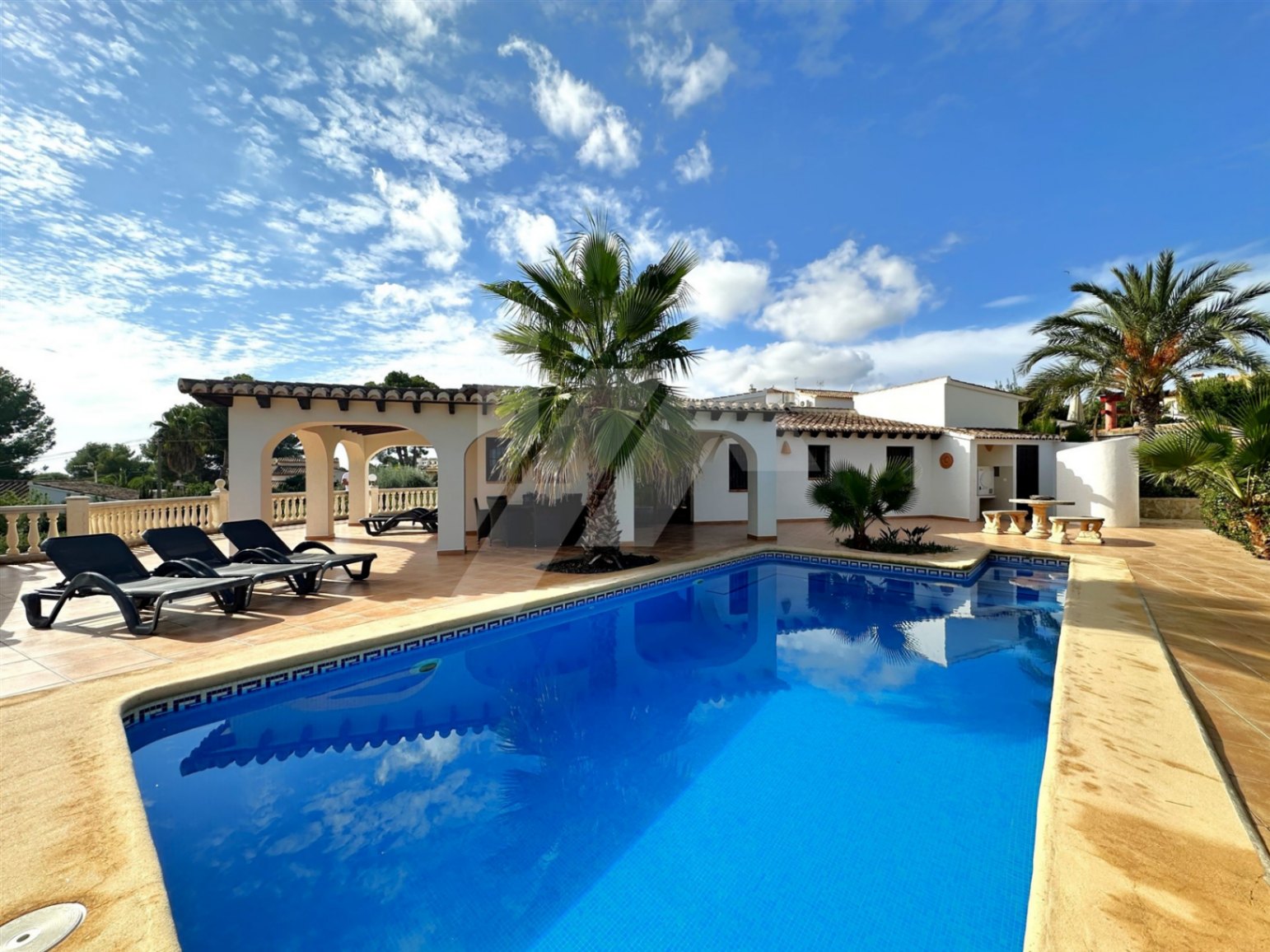 En el exterior destaca una gran terraza parcialmente cubierta, para poder disfrutar del sol en invierno y de la sombra en verano, y una preciosa piscina con vistas abiertas a Benitachell y Moraira. En la terraza encontramos también un aseo y una ducha exterior, para mayor comodidad de los usuarios.
