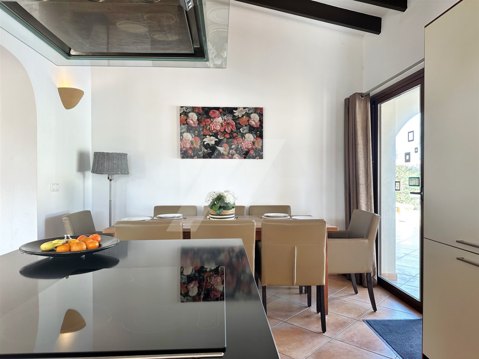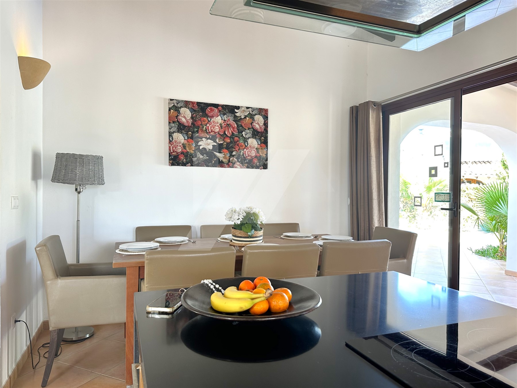 La casa tiene una superficie construida de 302m2 que se asientan sobre una parcela de 835m2, y su distribución es en una sola planta con espacios amplios y acogedores, proporcionando una gran comodidad a sus propietarios. La cocina es abierta y de gran tamaño, contando con una isla central y estando conectada visual y físicamente al comedor, por un lado, y al salón, por el otro. Todas estas zonas de la casa son muy luminosas gracias a grandes ventanas y puertas acristaladas que las circundan.