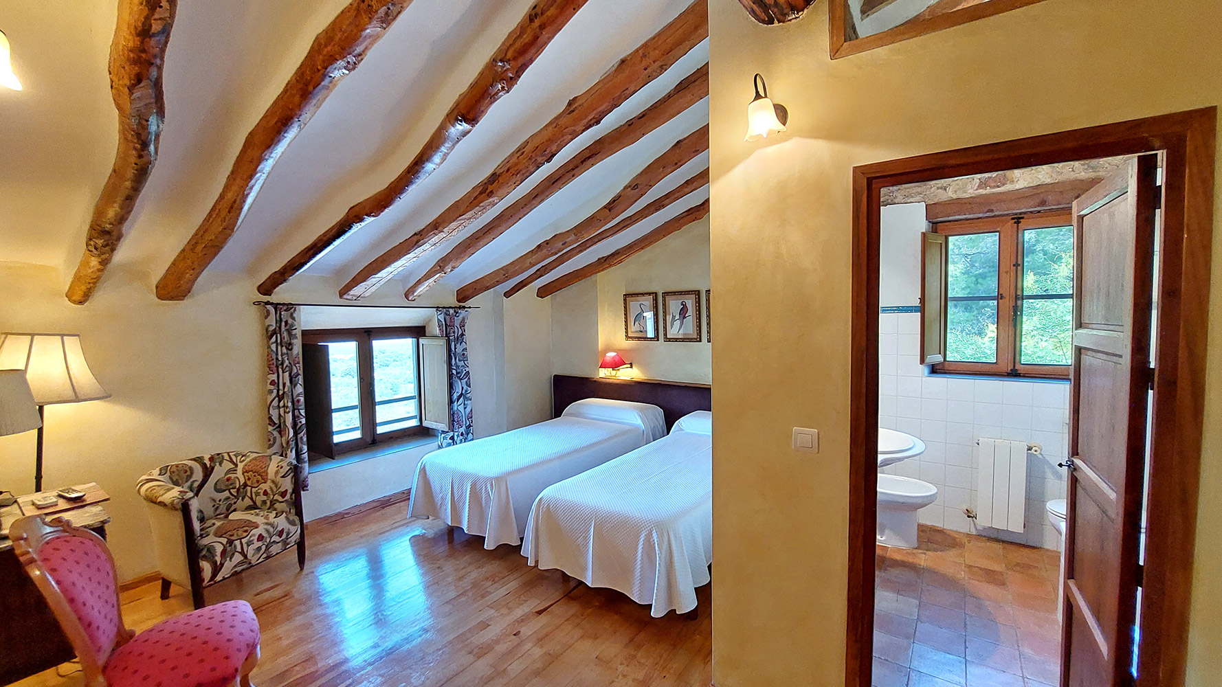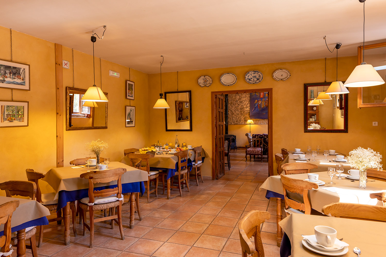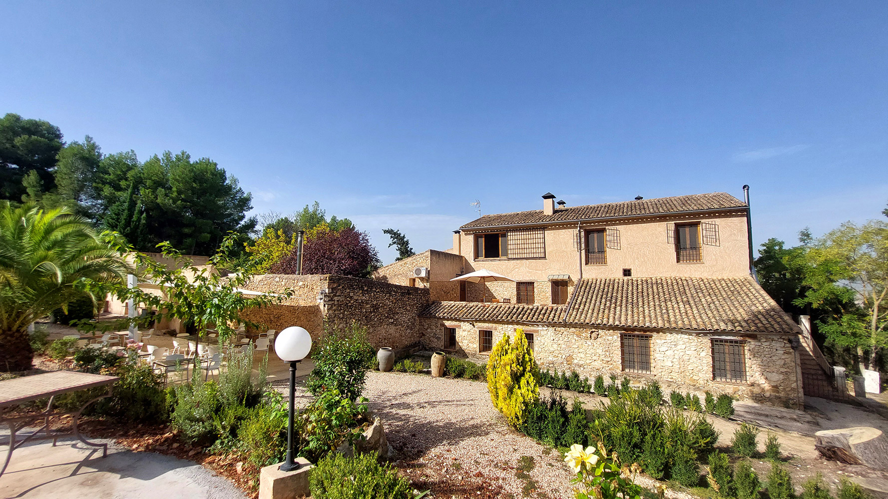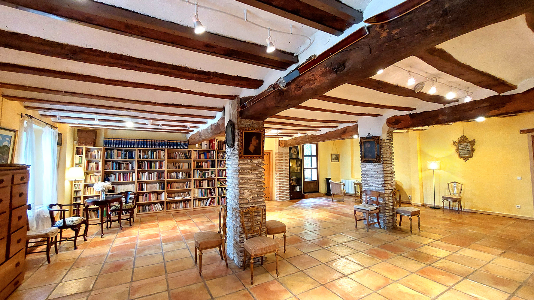 Dentro del edificio principal, el cual se distribuye en tres plantas, encontramos dos espacios separados: el hotel y la casa privada de los propietarios. El primero dispone de cuatro salones para todo tipo de actividades o celebraciones (uno de ellos con chimenea tradicional), una preciosa biblioteca de 87 m2, una cocina profesional, una recepción, varios cuartos de almacenamiento, aljibes, 8 habitaciones dobles de entre 13 y 18m2, todas con baño propio, y dos baños adicionales para las zonas comunes. El segundo cuenta con una superficie de 100m2 y tiene acceso independiente, estando compuesto en la actualidad por tres dormitorios, dos cuartos de baño, salón y cocina. Existe un proyecto para añadir este espacio al hotel. En ese caso serían cuatro habitaciones dobles adicionales con sus respectivos cuartos de baño en suite.