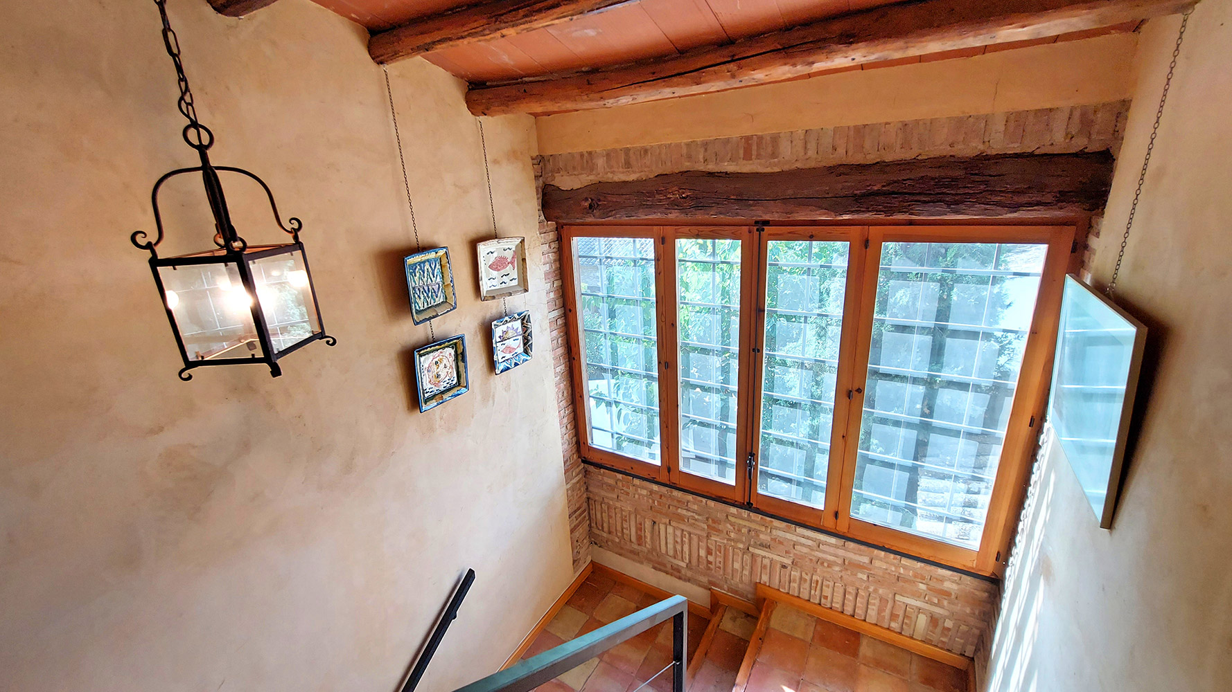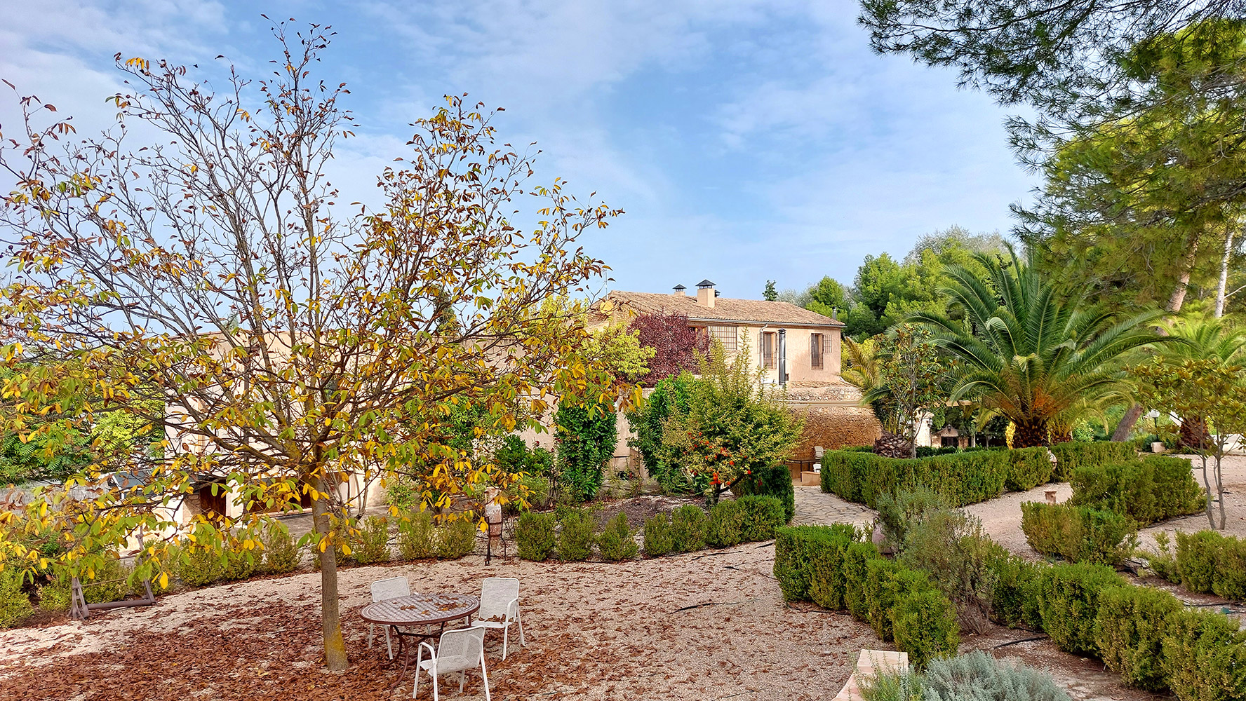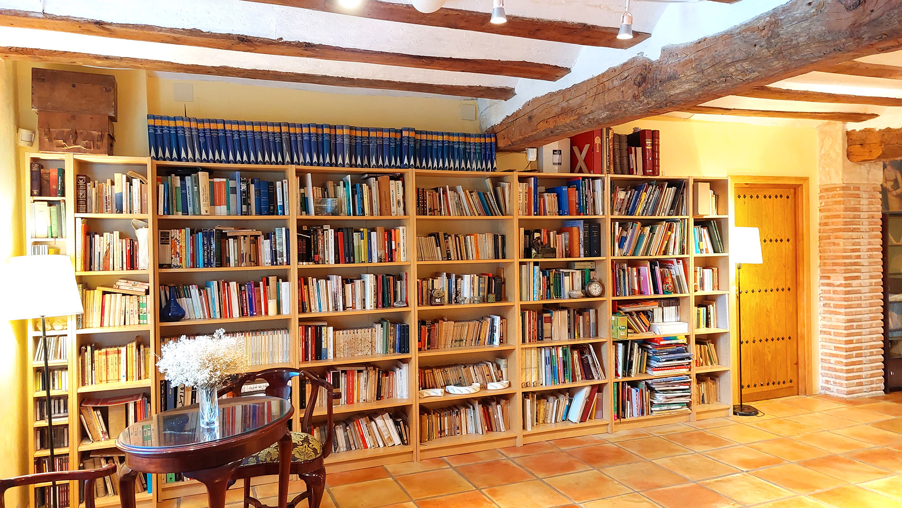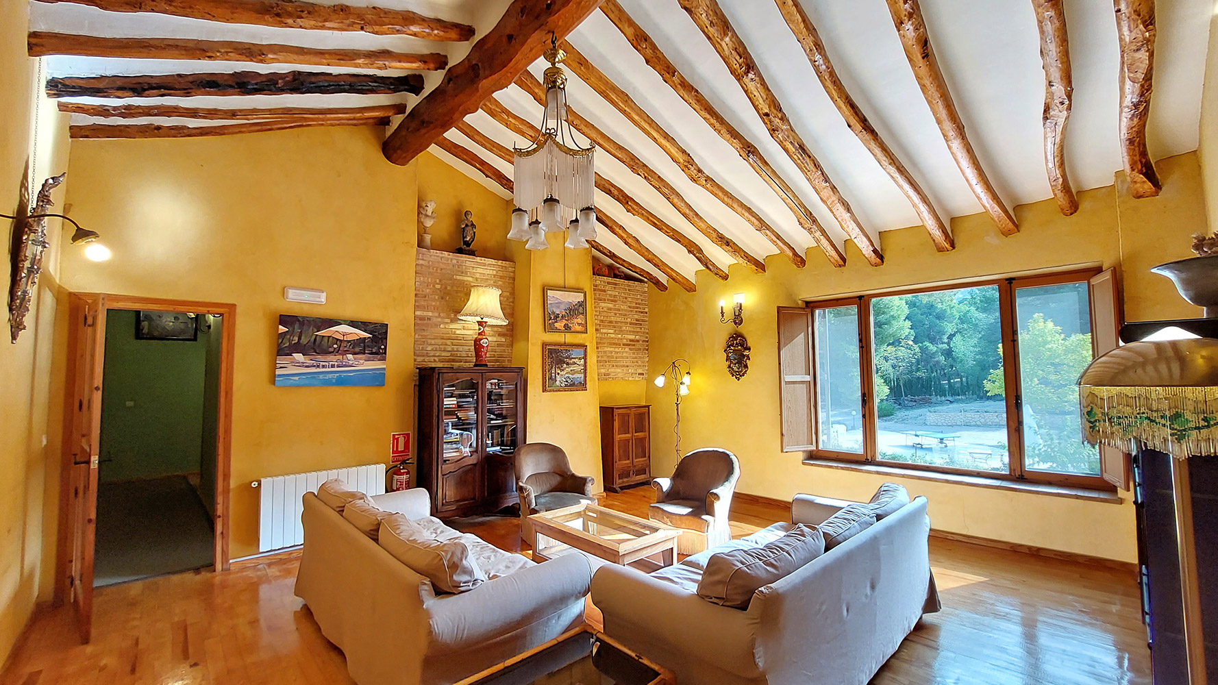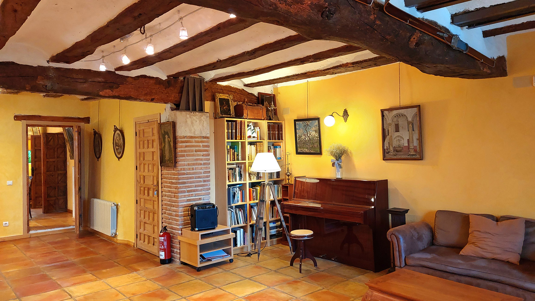 Dentro del edificio principal, el cual se distribuye en tres plantas, encontramos dos espacios separados: el hotel y la casa privada de los propietarios. El primero dispone de cuatro salones para todo tipo de actividades o celebraciones (uno de ellos con chimenea tradicional), una preciosa biblioteca de 87 m2, una cocina profesional, una recepción, varios cuartos de almacenamiento, aljibes, 8 habitaciones dobles de entre 13 y 18m2, todas con baño propio, y dos baños adicionales para las zonas comunes. El segundo cuenta con una superficie de 100m2 y tiene acceso independiente, estando compuesto en la actualidad por tres dormitorios, dos cuartos de baño, salón y cocina. Existe un proyecto para añadir este espacio al hotel. En ese caso serían cuatro habitaciones dobles adicionales con sus respectivos cuartos de baño en suite.