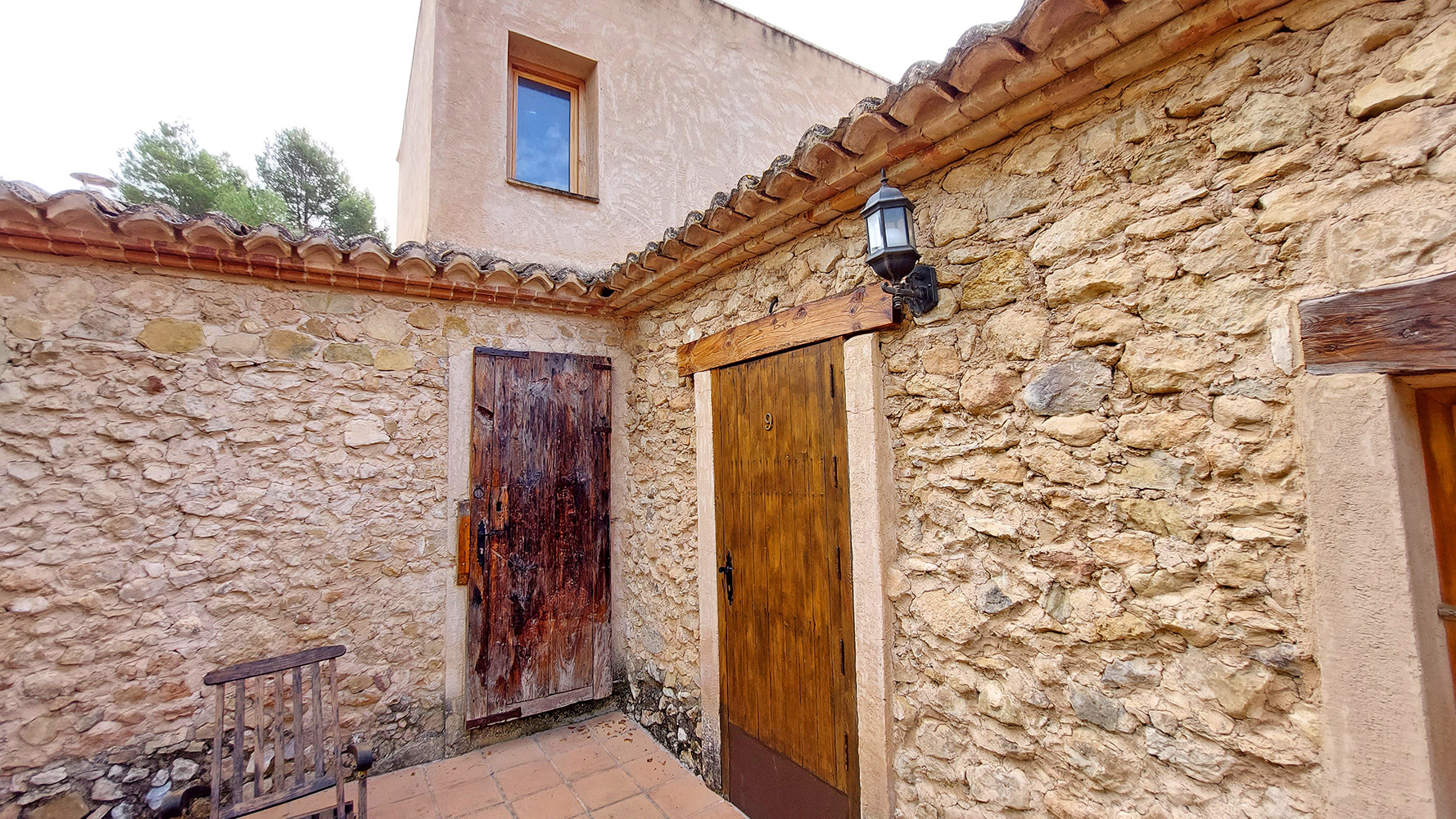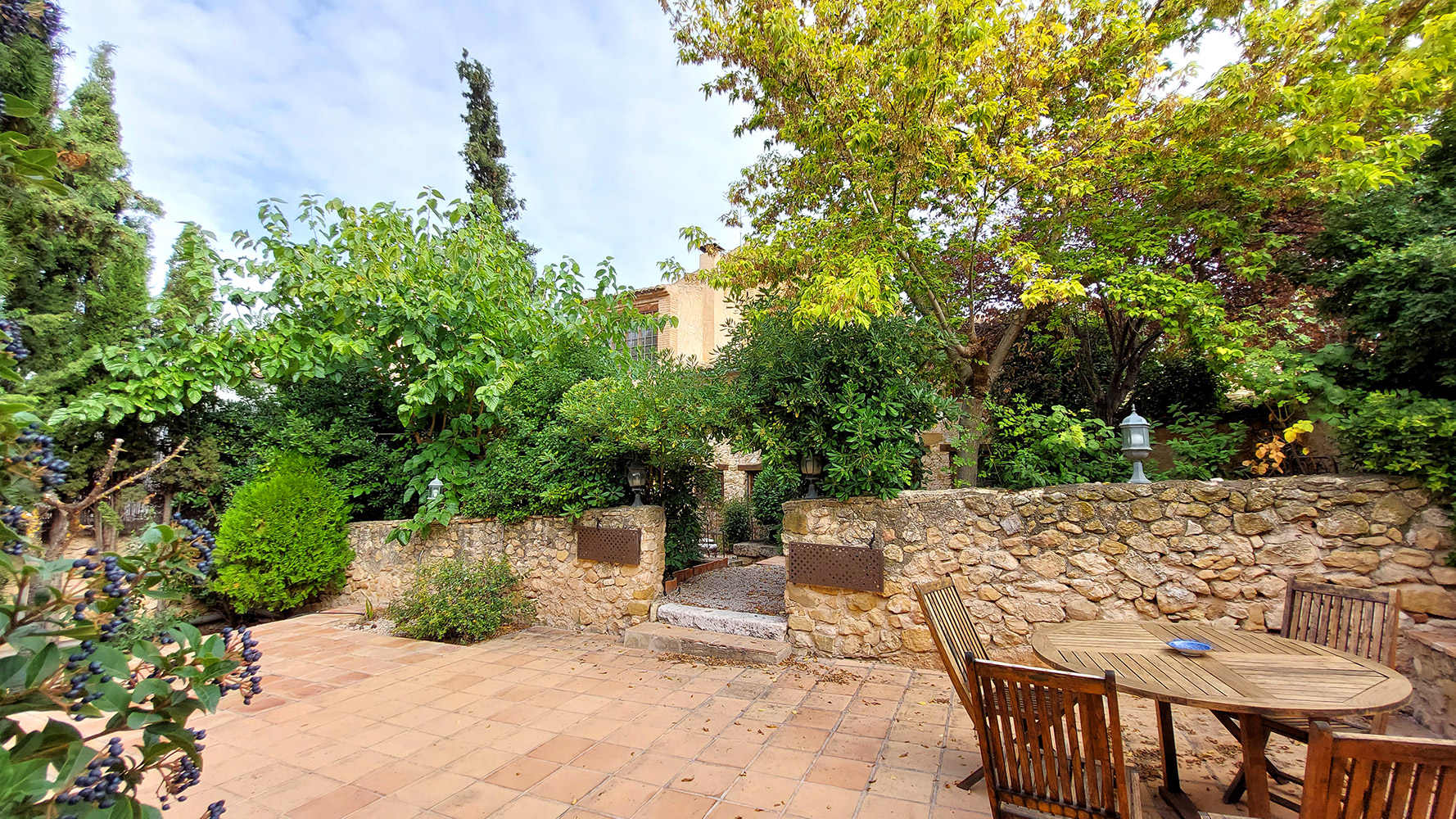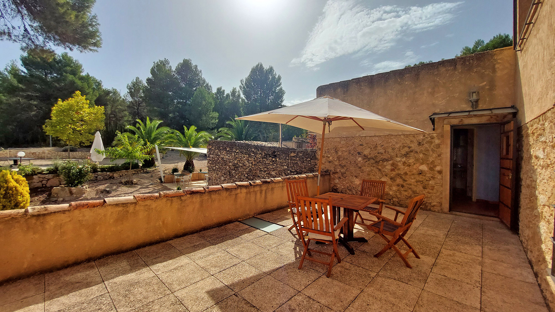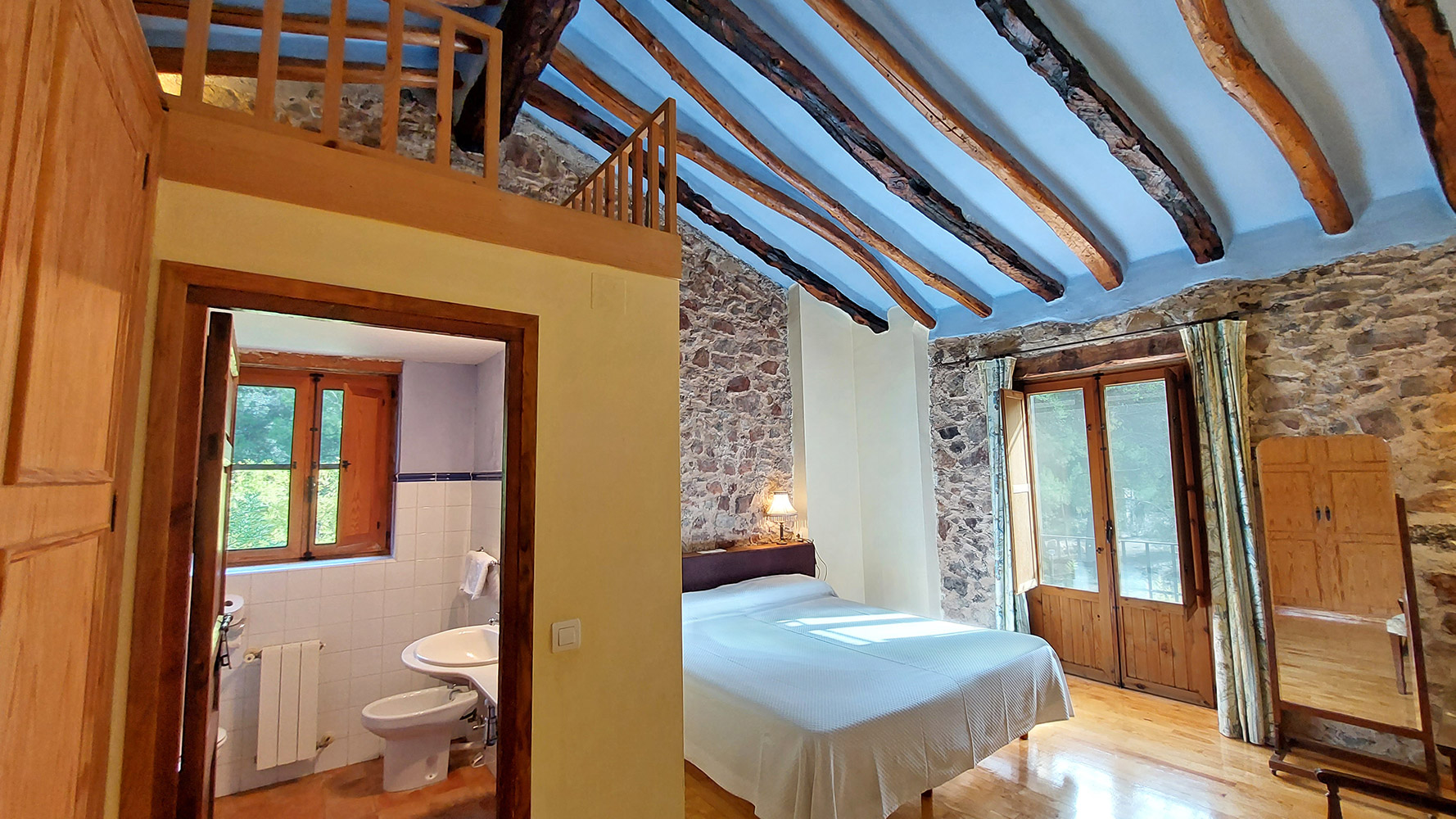 Atravesando un frondoso patio tipo mediterráneo se accede al edificio secundario, en el que encontramos la novena habitación del hotel, que es la más amplia (21m2) y también dispone de baño propio. Además existe un gran espacio cerrado de dos plantas con la carpintería interior hecha, que se podría convertir en un apartamento dúplex con mucha privacidad.