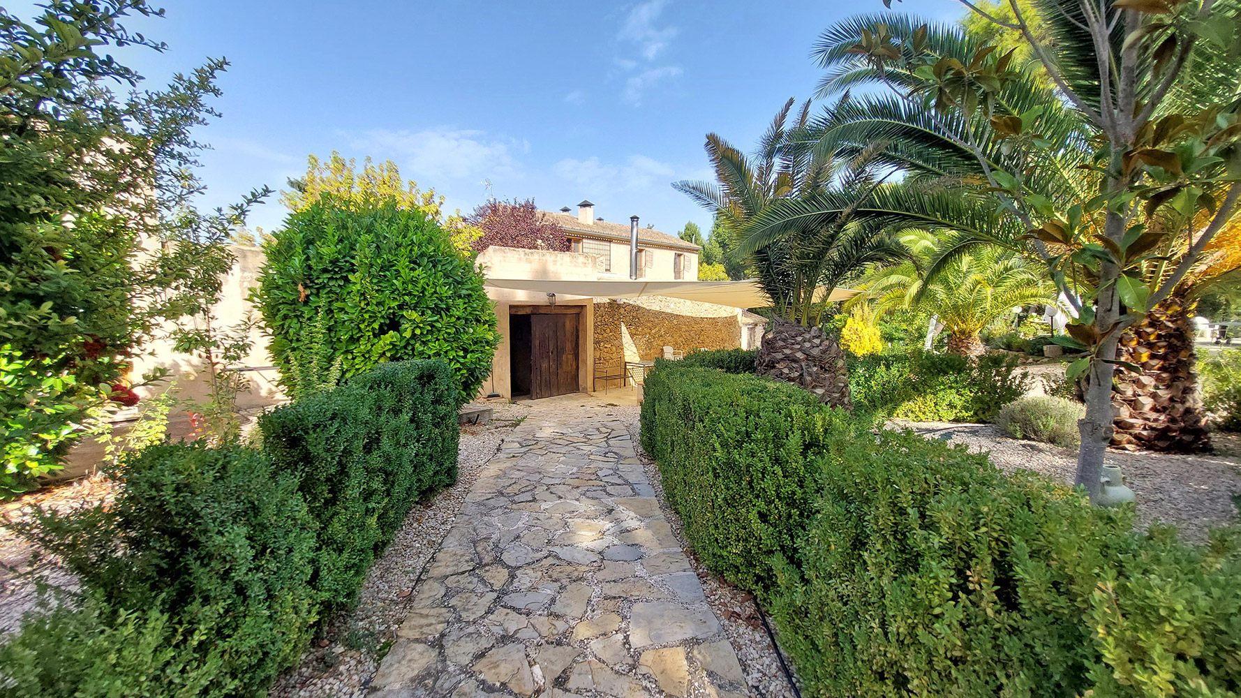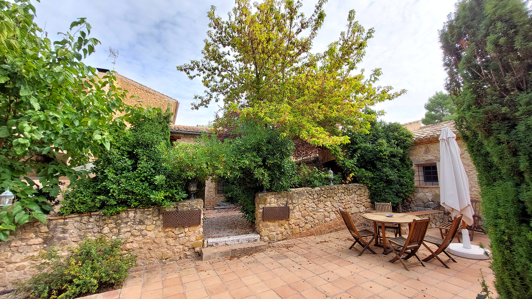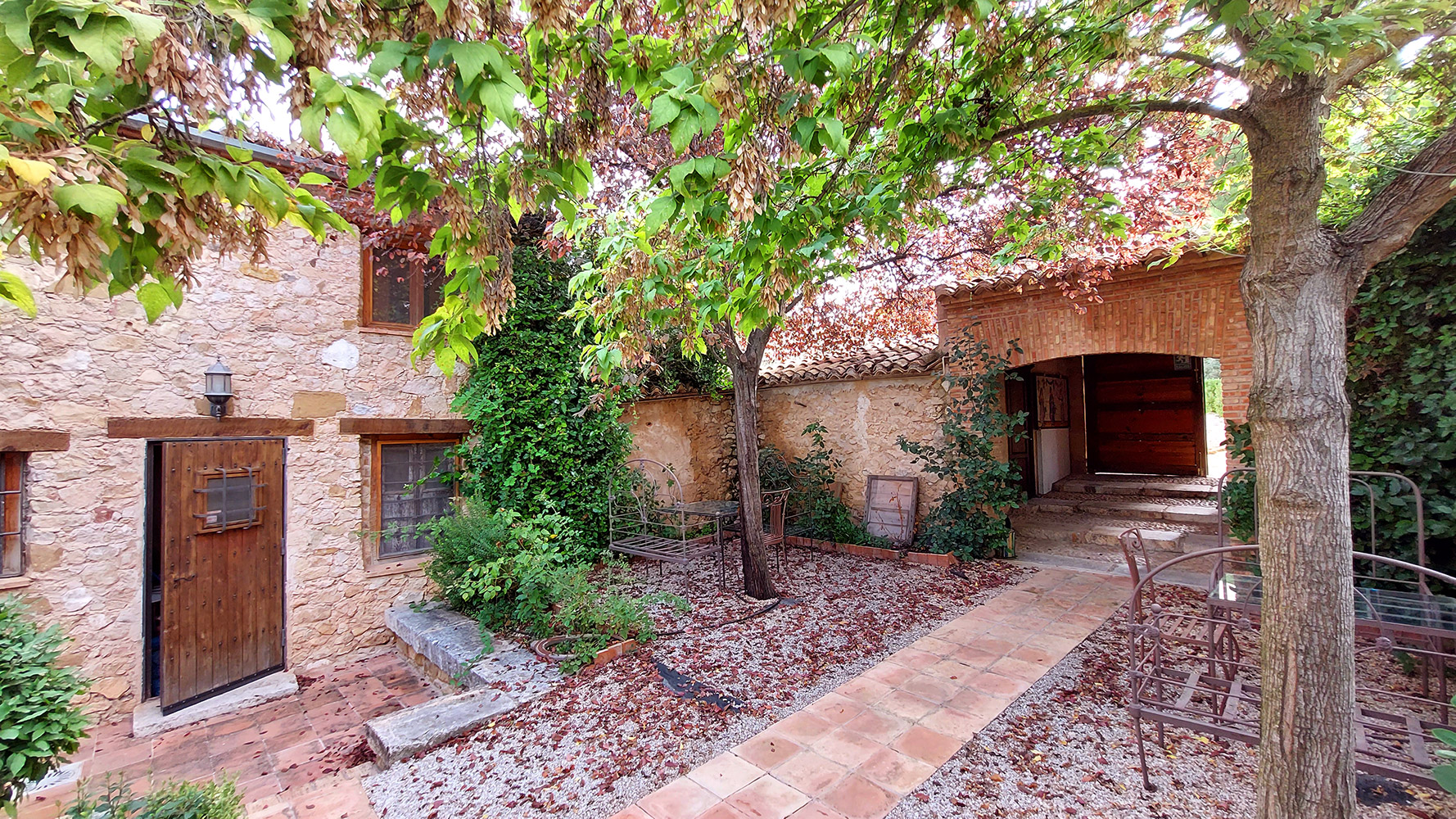 Atravesando un frondoso patio tipo mediterráneo se accede al edificio secundario, en el que encontramos la novena habitación del hotel, que es la más amplia (21m2) y también dispone de baño propio. Además existe un gran espacio cerrado de dos plantas con la carpintería interior hecha, que se podría convertir en un apartamento dúplex con mucha privacidad.