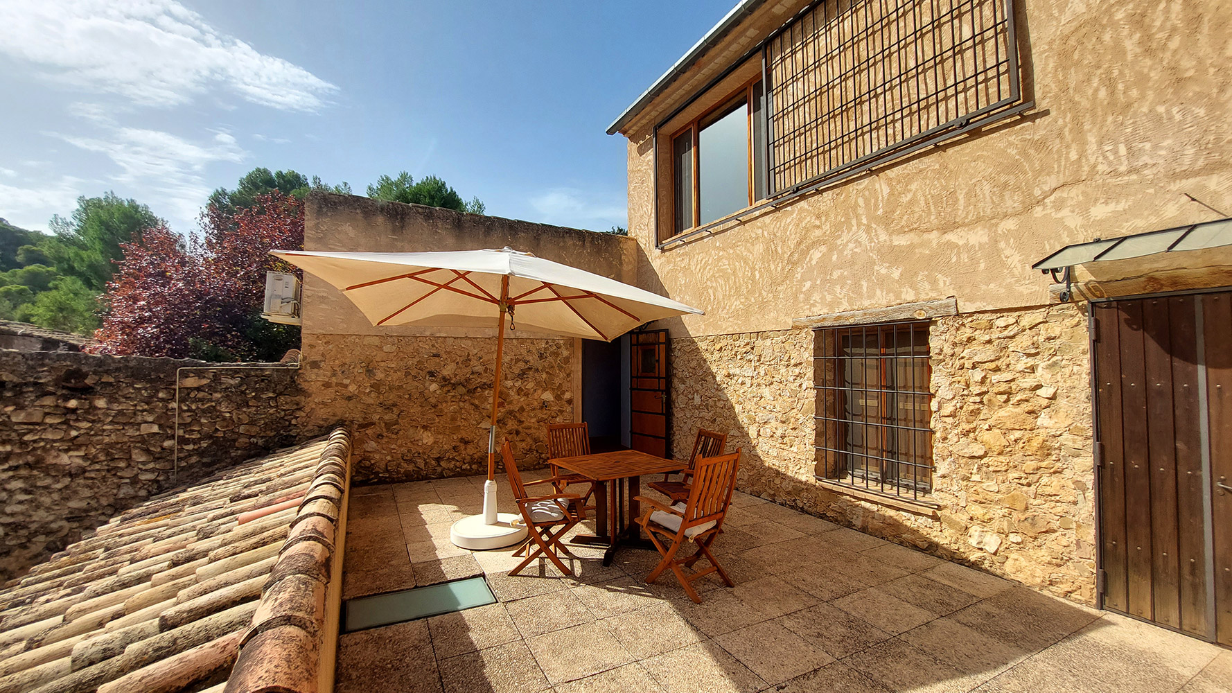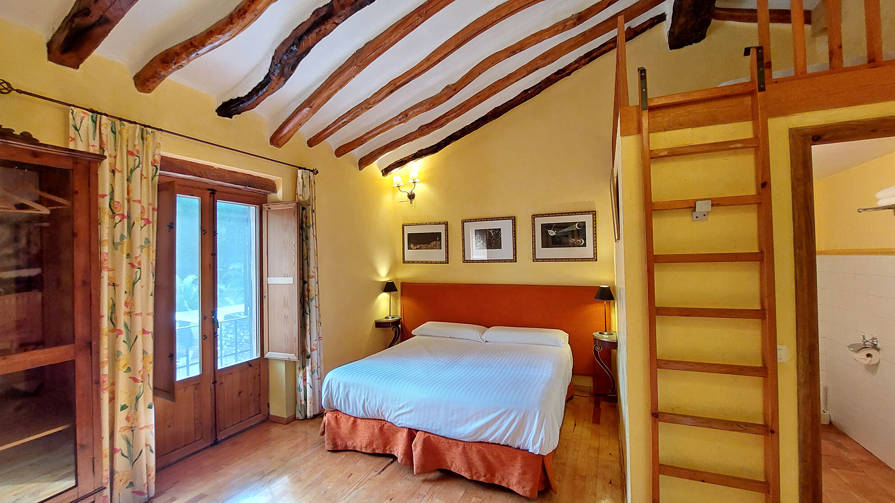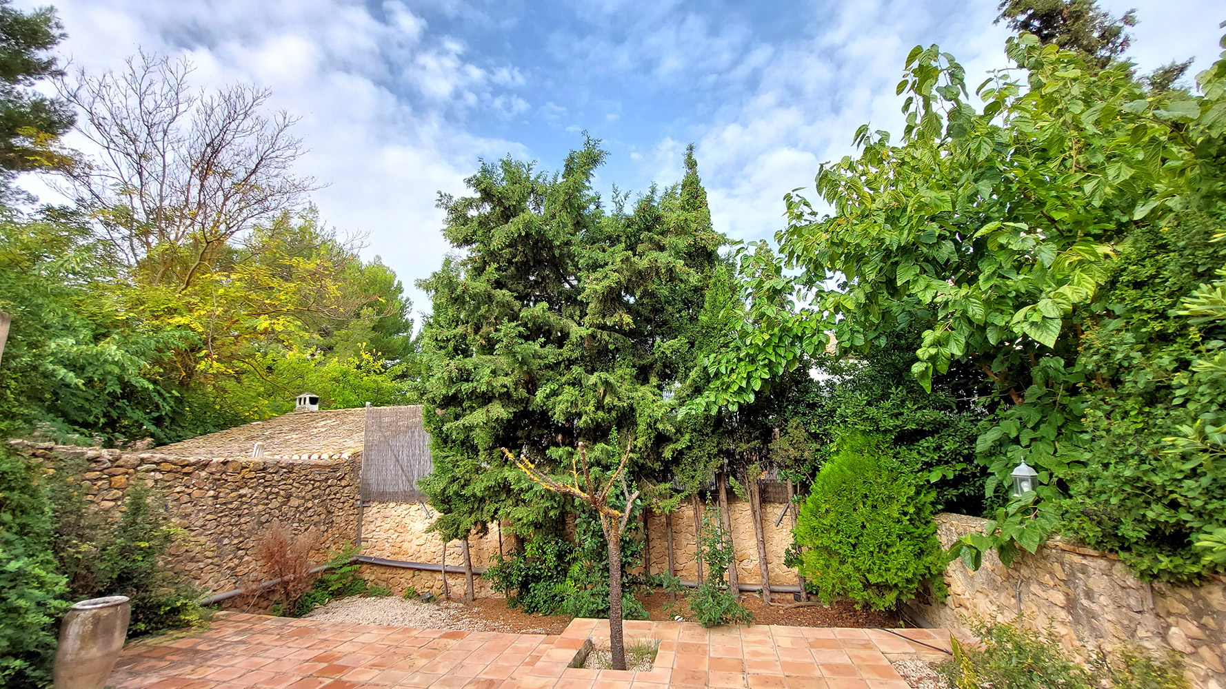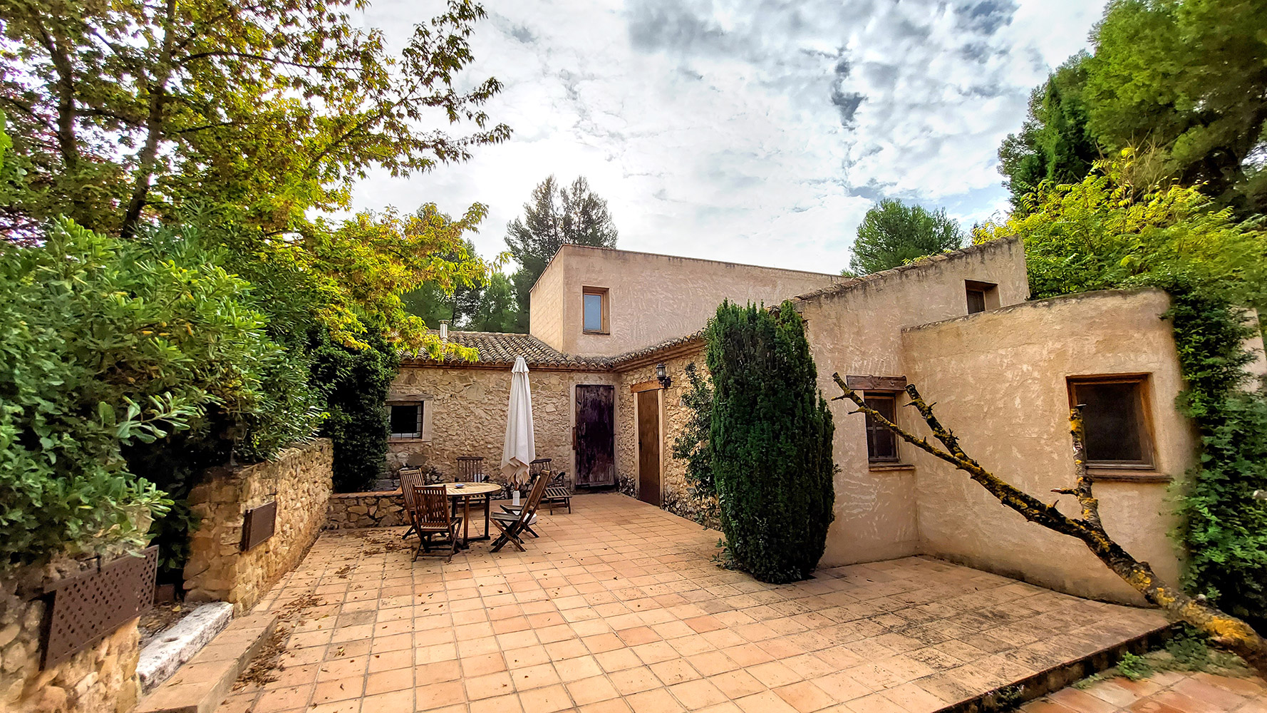 Atravesando un frondoso patio tipo mediterráneo se accede al edificio secundario, en el que encontramos la novena habitación del hotel, que es la más amplia (21m2) y también dispone de baño propio. Además existe un gran espacio cerrado de dos plantas con la carpintería interior hecha, que se podría convertir en un apartamento dúplex con mucha privacidad.