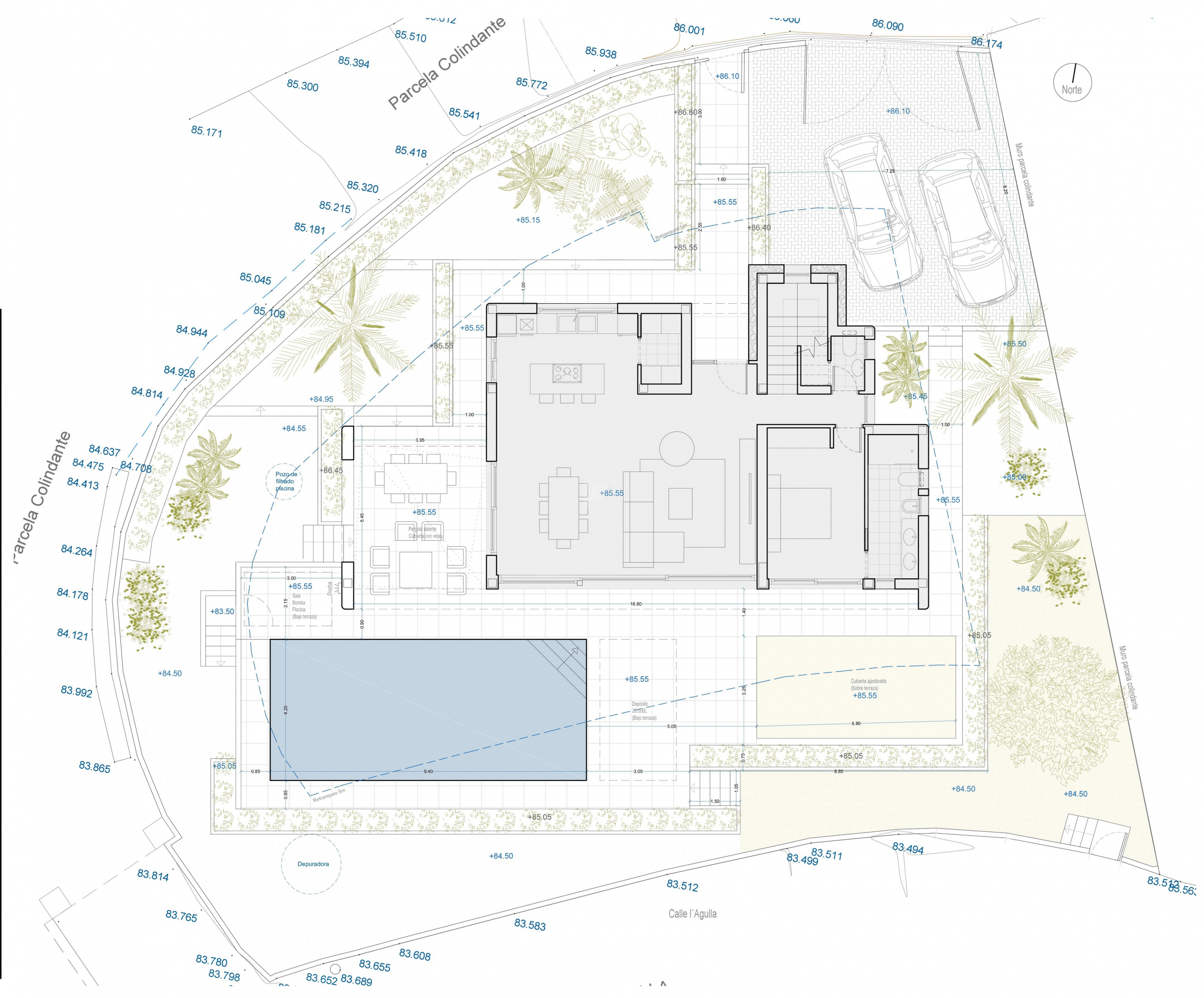 La maison dispose d’un parking pour deux véhicules, auquel on accède par un portail électrique. Il y a aussi un accès indépendant pour le personnel d’entretien dans la partie inférieure de la parcelle.