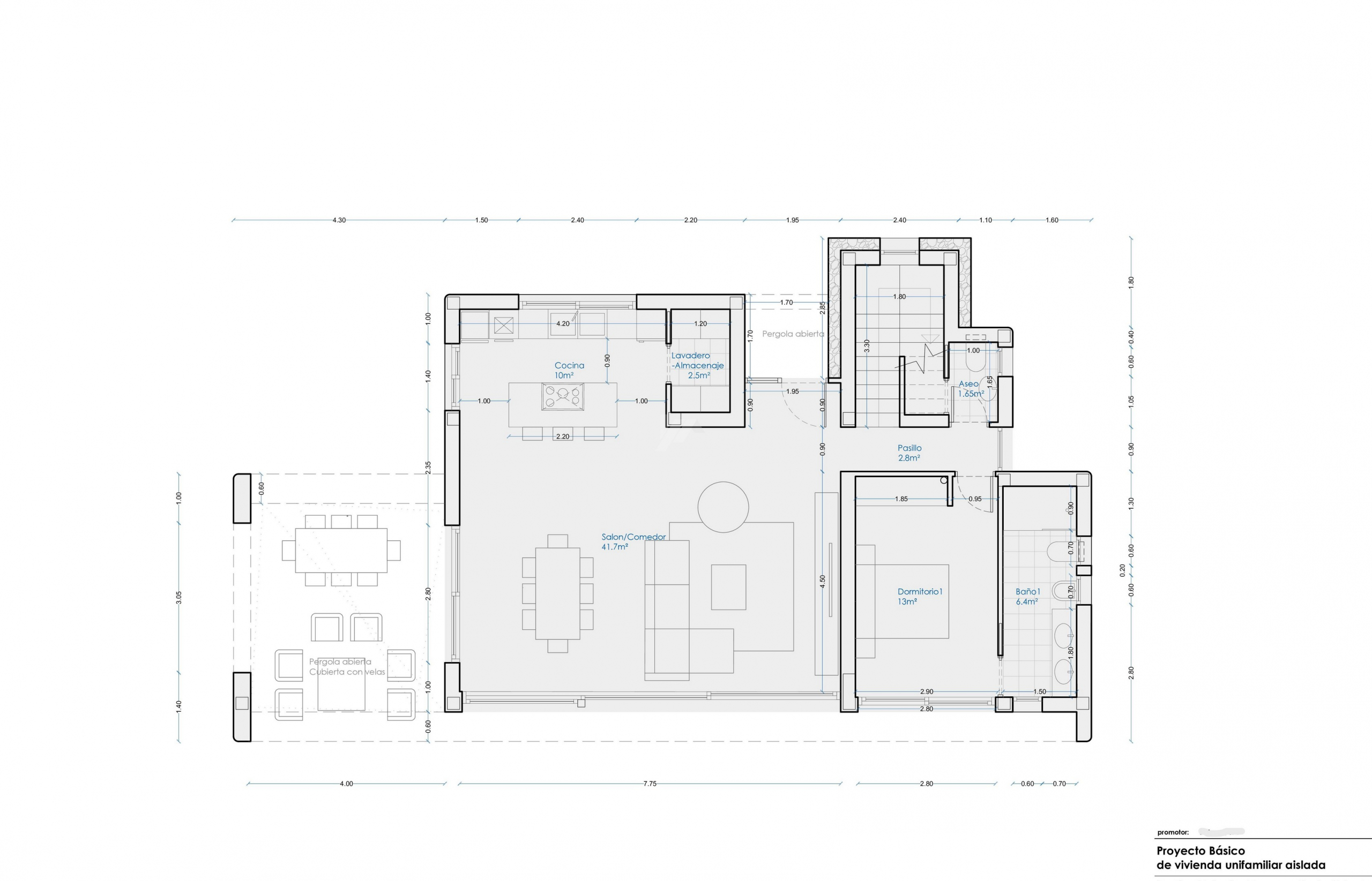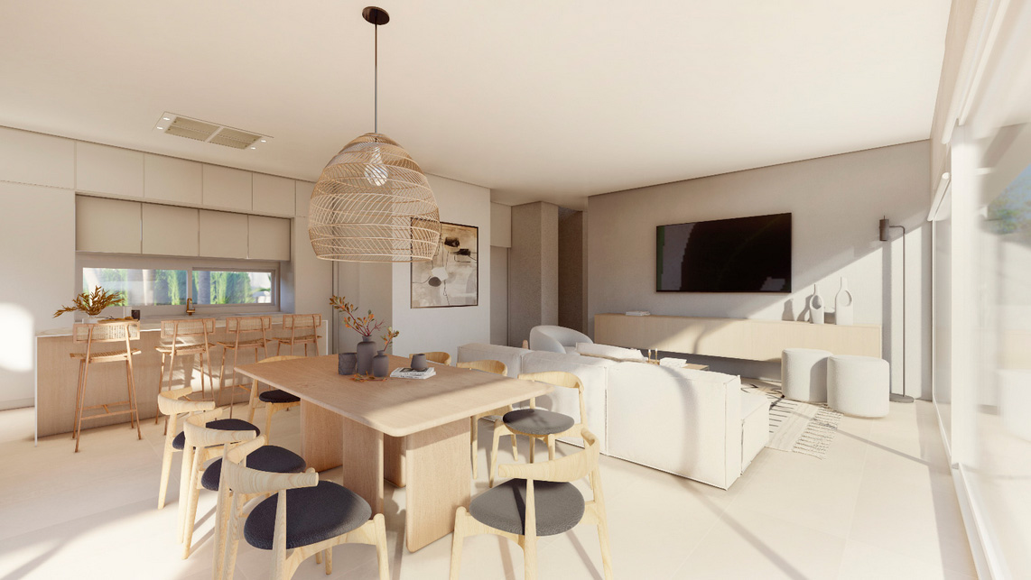 Sa superficie construite est de 157m2 sur un terrain de 625m2, avec une distribution sur deux étages. Au rez-de-chaussée, nous trouvons un hall d’entrée, un spacieux salon-salle à manger, une cuisine ouverte, la chambre principale et des toilettes invités. De cet étage, nous accédons à la grande terrasse extérieure de 187m2 où l’on trouve une piscine éclairée de 9,4 x 4,2 mètres, ainsi qu’un beau jardin.