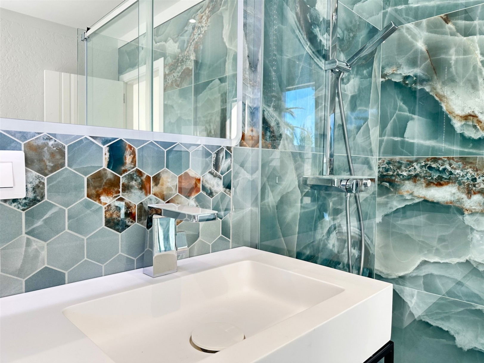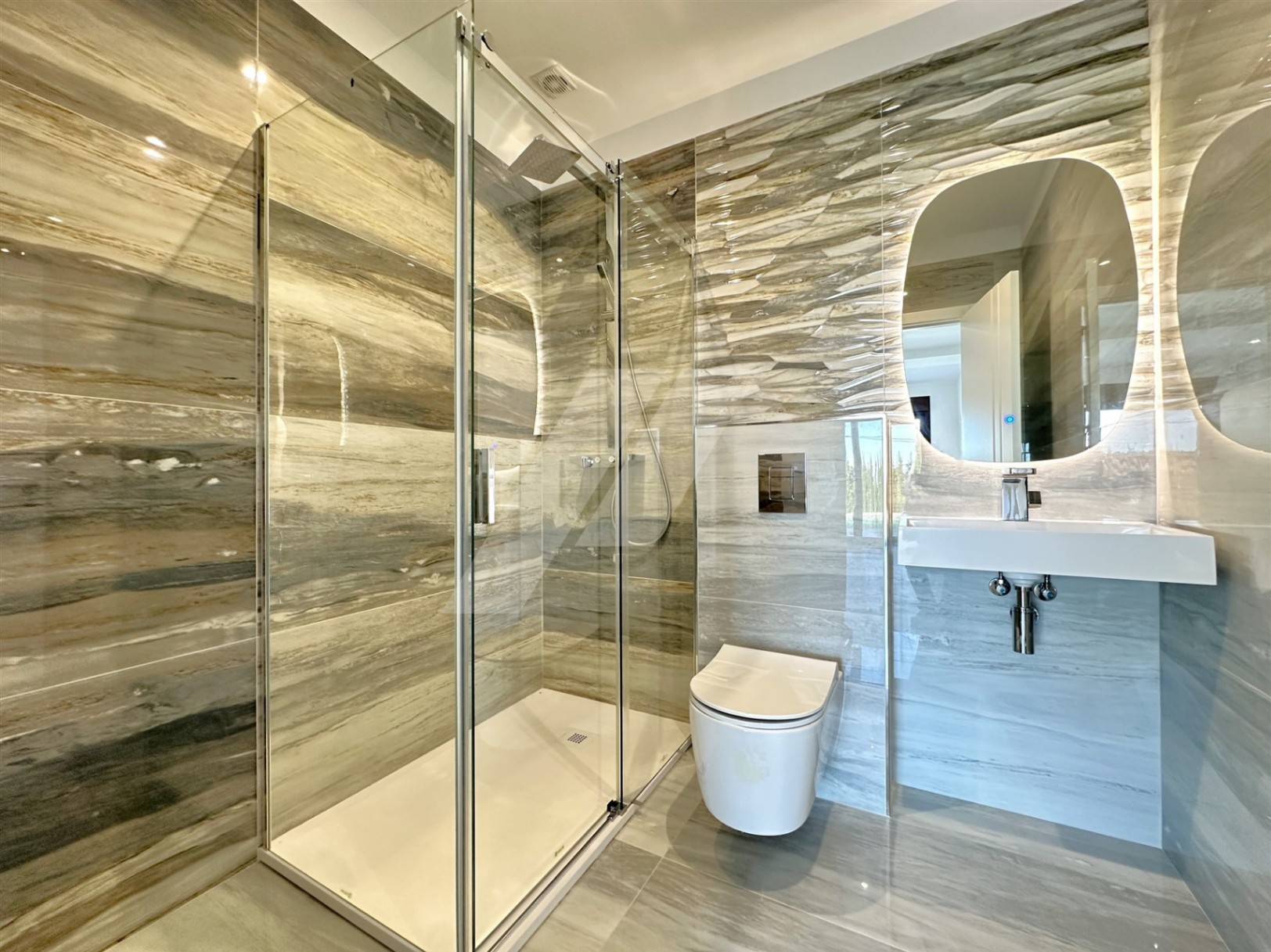 The ground floor offers three spacious bedrooms (all with en-suite bathrooms and built-in wardrobes), with direct accesses to the spectacular pool area, designed to fully enjoy the Mediterranean climate. On this same level, there are a laundry room and a storage room.