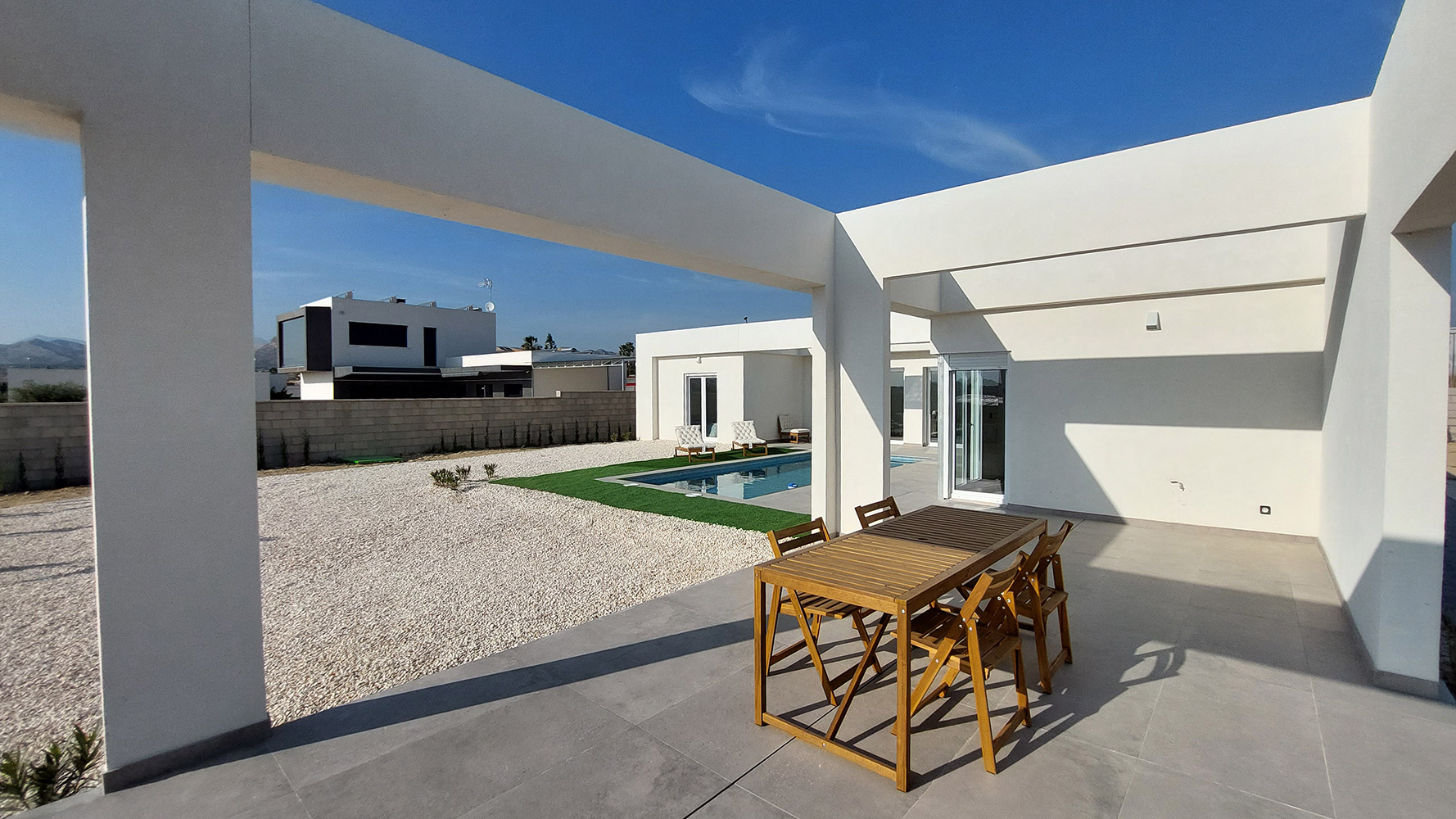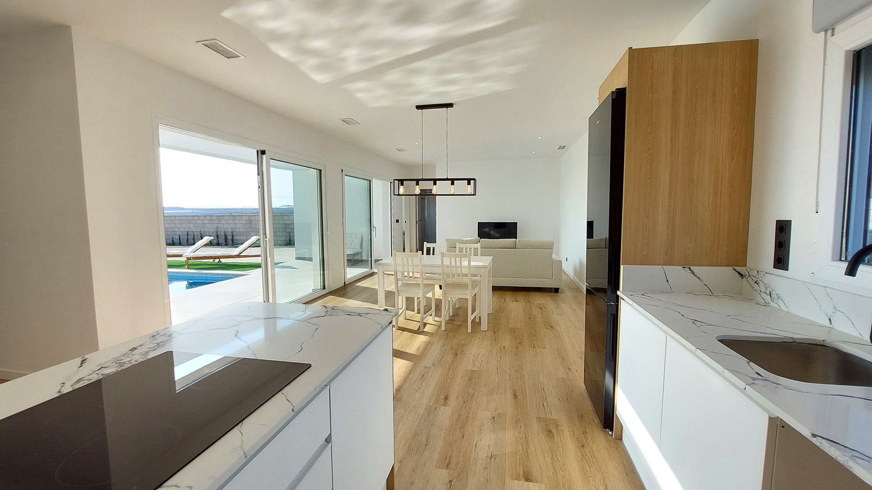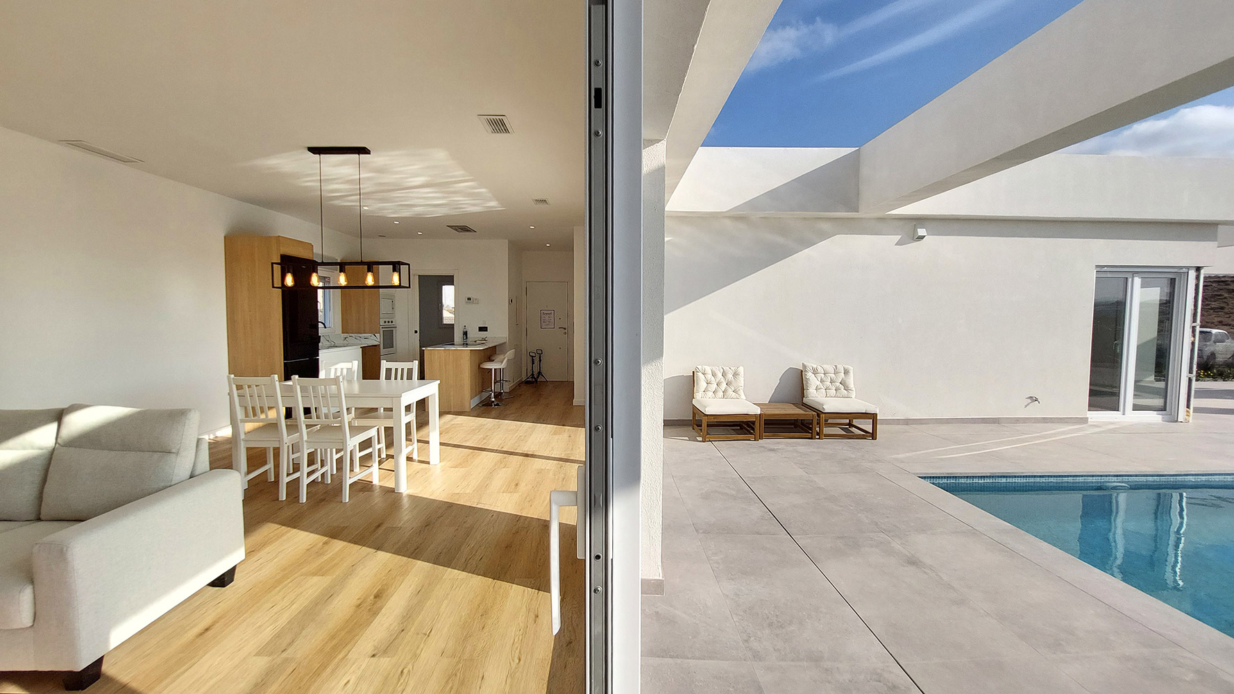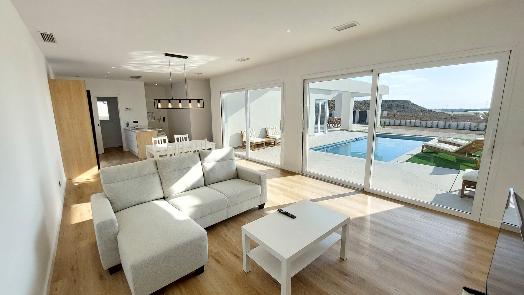 From the living room, and through two gigantic double glass sliding doors, we reach the outdoor area where we find a beautiful 7 x 3 m rectangular pool, a large 60m2 semi-covered porch and the garden.