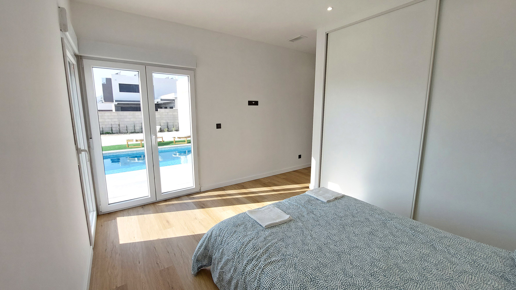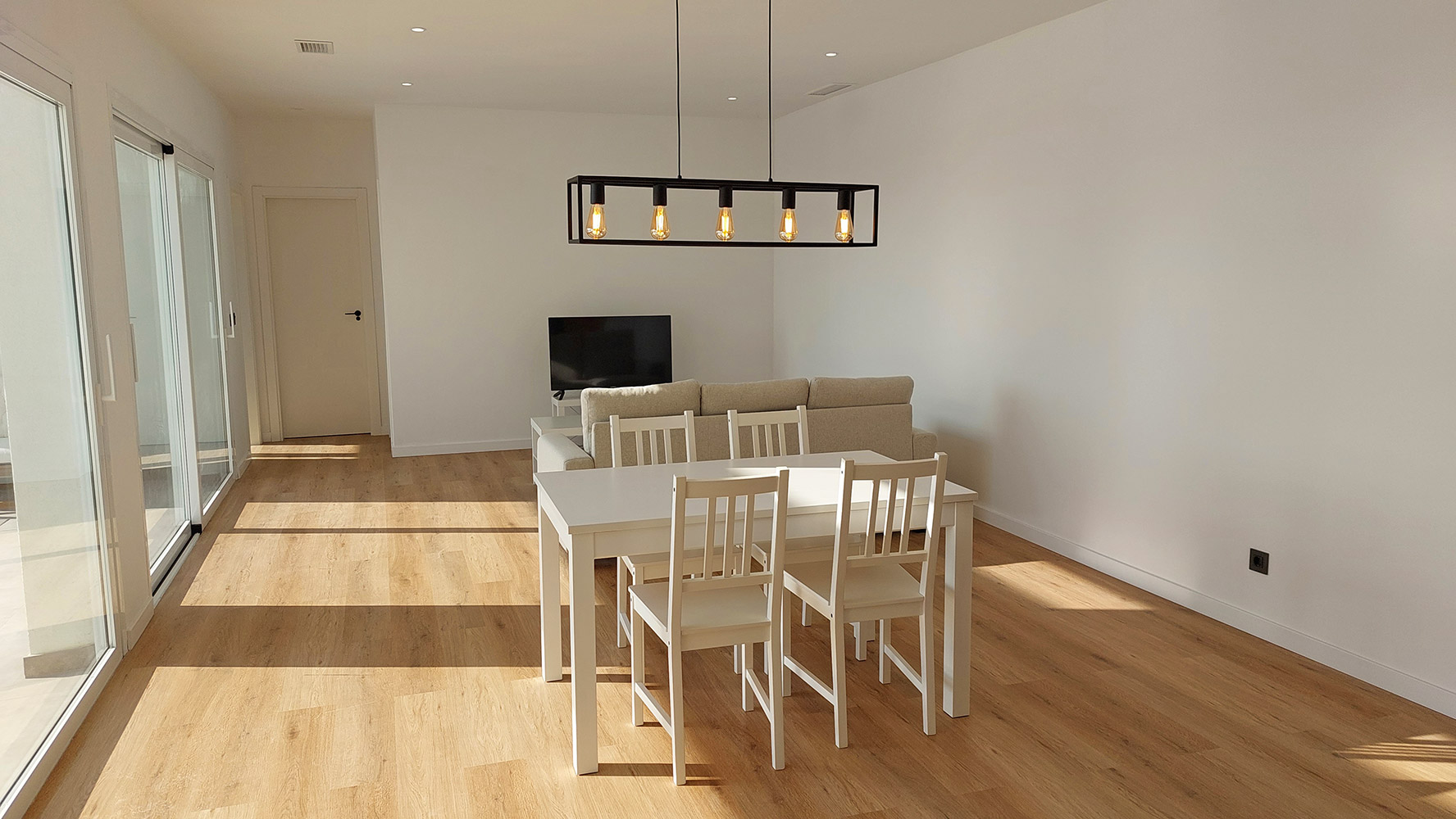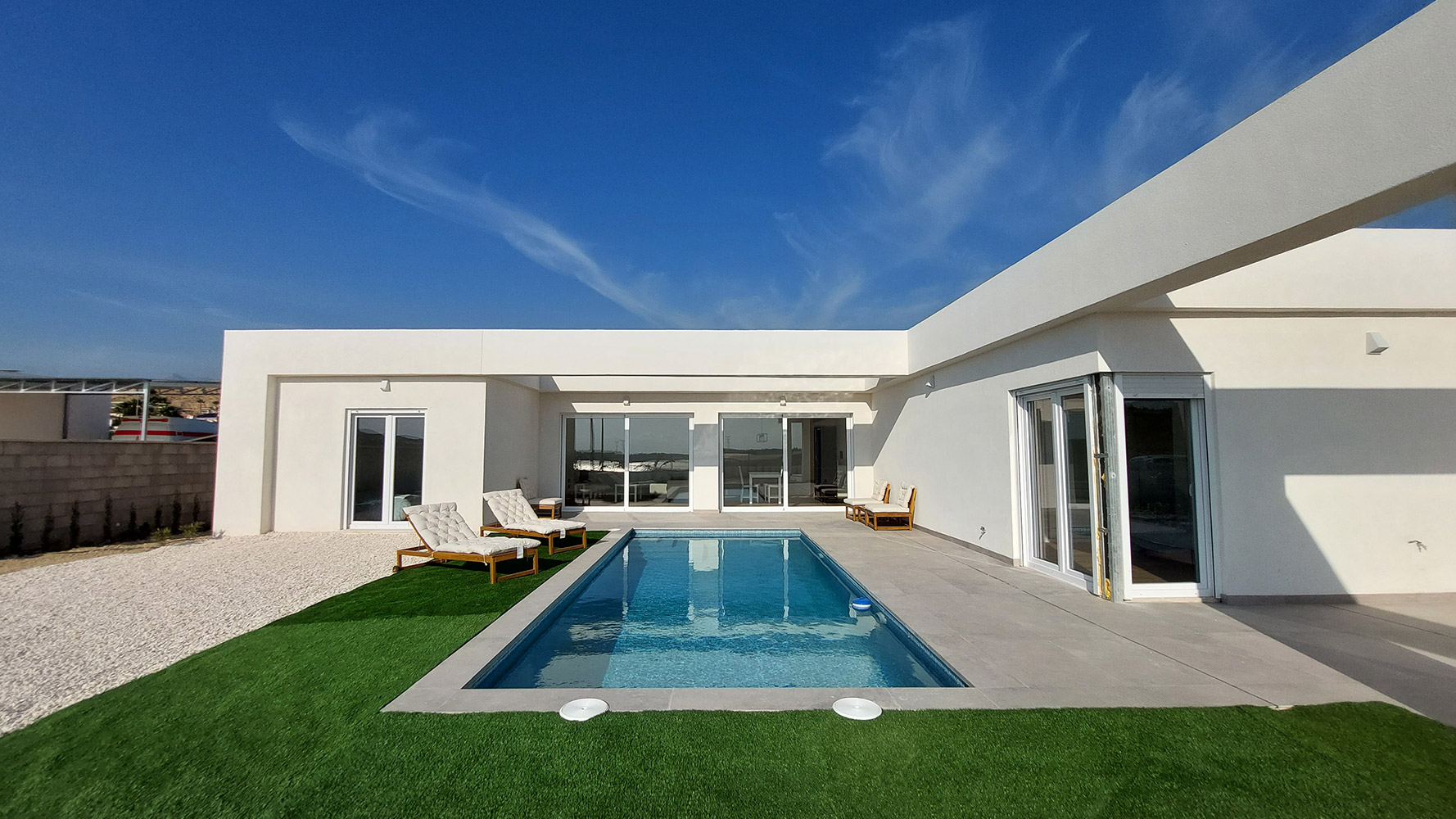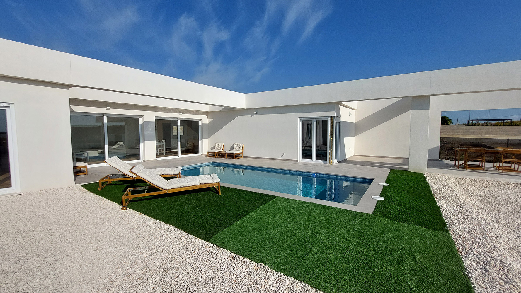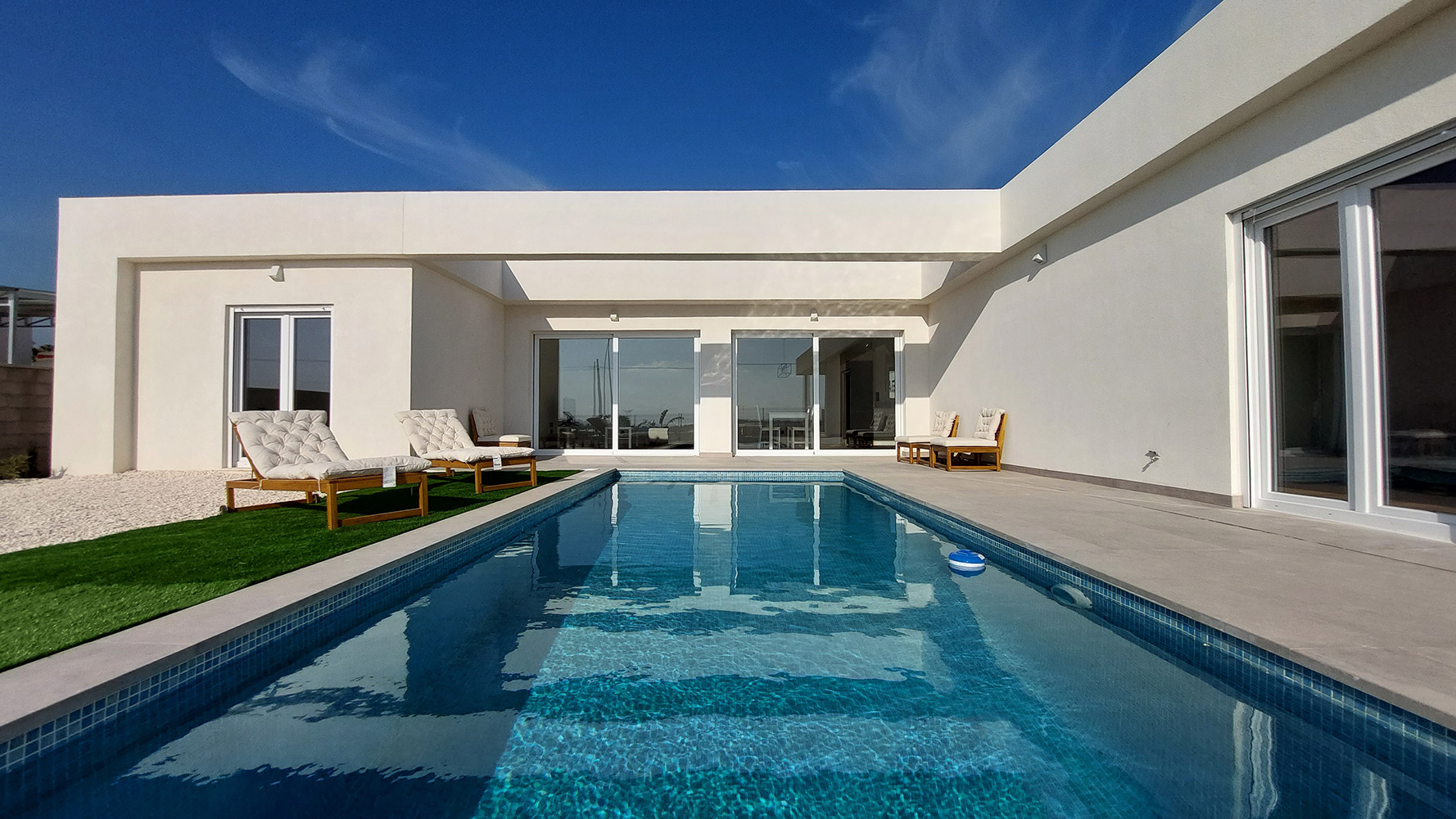 From the living room, and through two gigantic double glass sliding doors, we reach the outdoor area where we find a beautiful 7 x 3 m rectangular pool, a large 60m2 semi-covered porch and the garden.