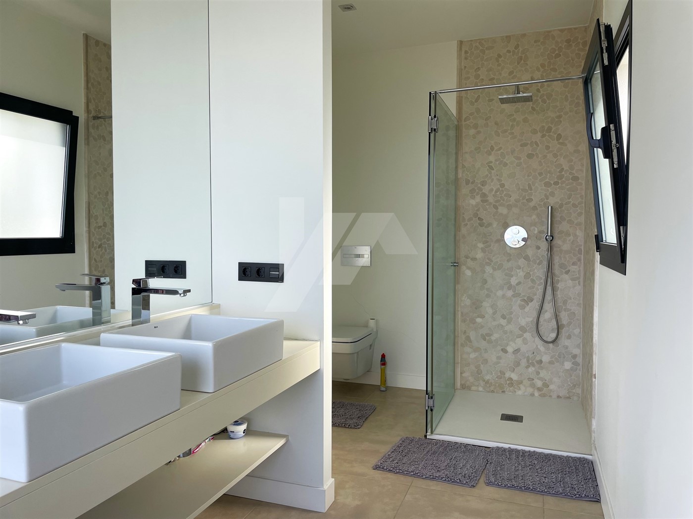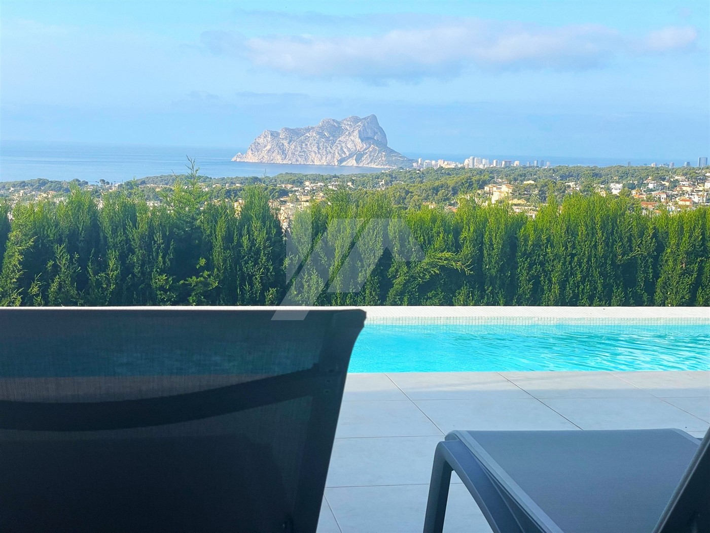 Once in the entrance hall, we are pleasantly surprised by the luminosity of a beautiful open space with large sliding glass doors to enjoy the wonderful views of the sea and the Peñón de Ifach. This level is distributed in a guest toilet, a large living-dining room with a fully equipped open-plan kitchen, two double bedrooms, both with dressing rooms, and a bathroom to share. From the living room, as well as from the two bedrooms, you can access the large terrace containing an infinity pool, an outdoor shower and a covered terrace where you can enjoy the shade on warm summer days. Via an internal staircase located in the living room, we access the upper floor of the house, where we find the master bedroom, with a dressing room and a spectacular bathroom, where you can enjoy beautiful views from the bathtub. Also on this floor is the fourth bedroom, which like the rest, has its own dressing room.