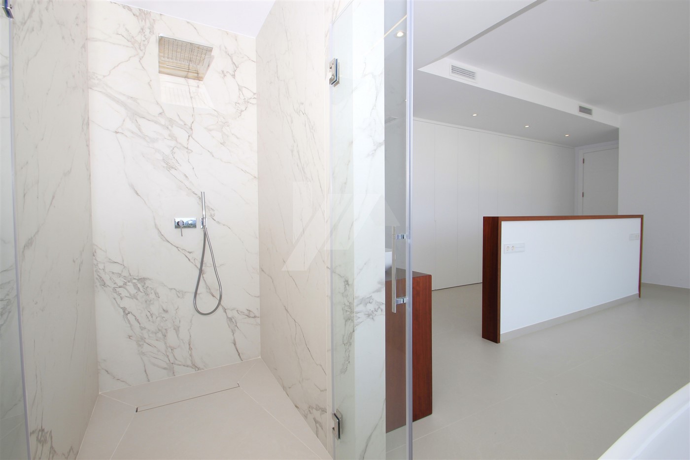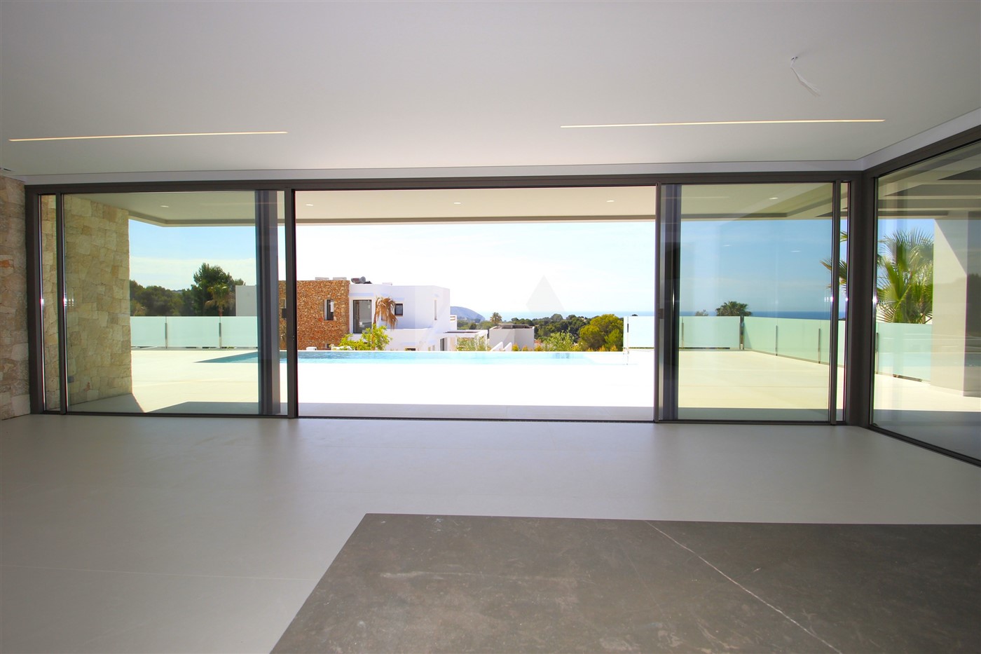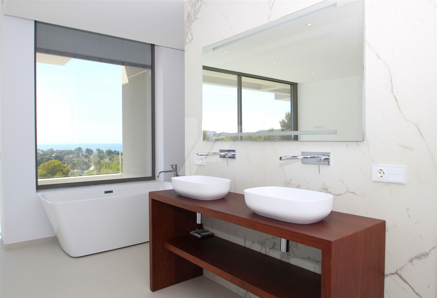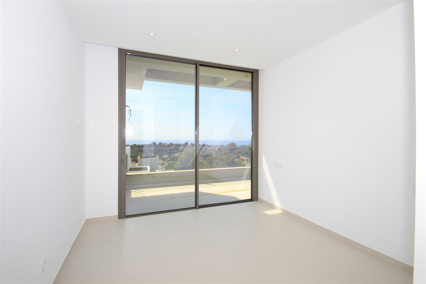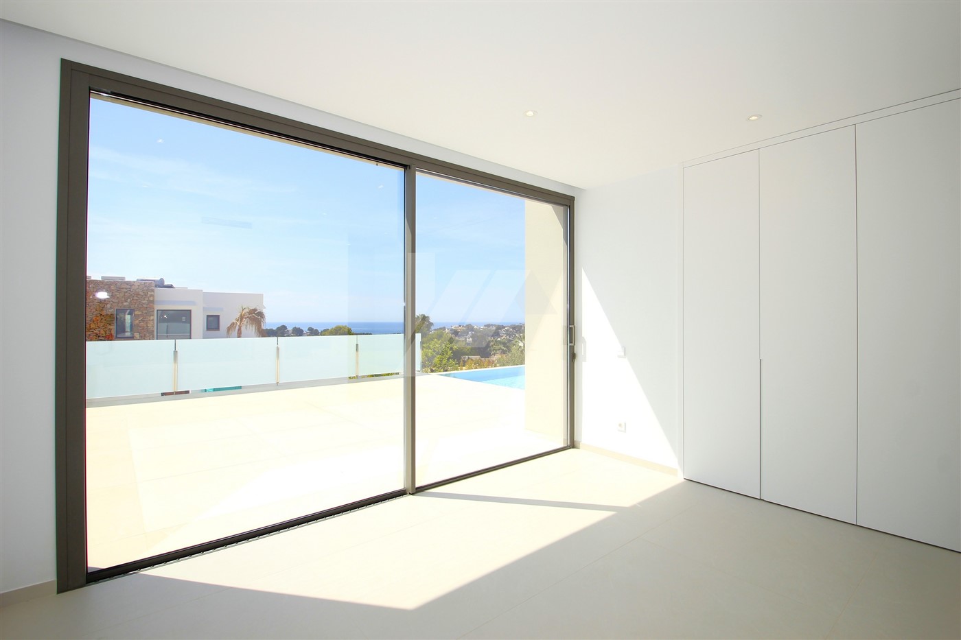 The imposing entrance door leads directly to the living room, the dining room and the open kitchen. Through large sliding doors, at the front and side of the house, you access a spacious terrace where we find the 4 x 10m infinity pool and a semi-covered area containing a summer kitchen. All windows at the back of the property have fully built-in, adjustable, electric blinds, as do all bathrooms. On this same level, there is also a guest toilet and a spacious bedroom with en-suite bathroom. The upper level consists of two double bedrooms sharing a bathroom and a large master bedroom with its own bathroom with shower and bathtub. There are good sea views from all bedrooms.
