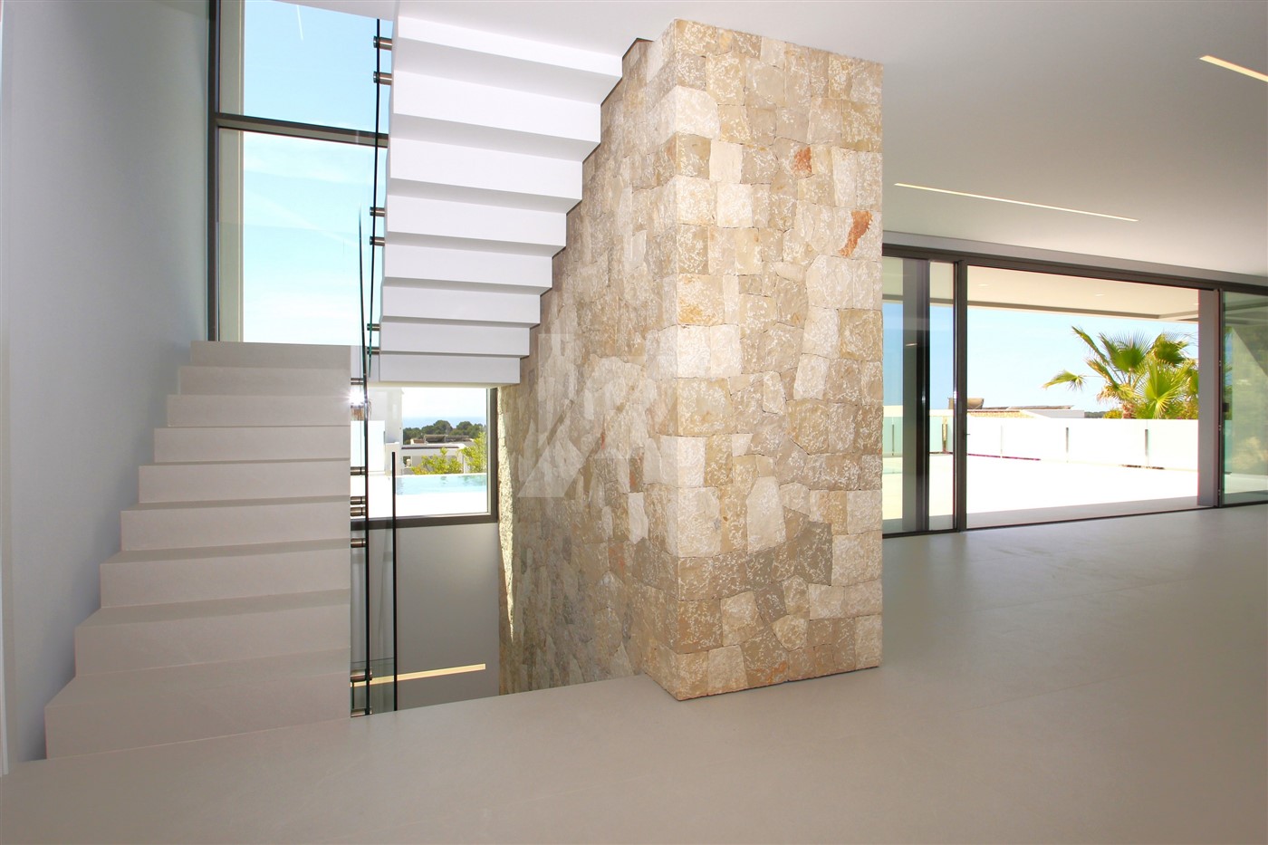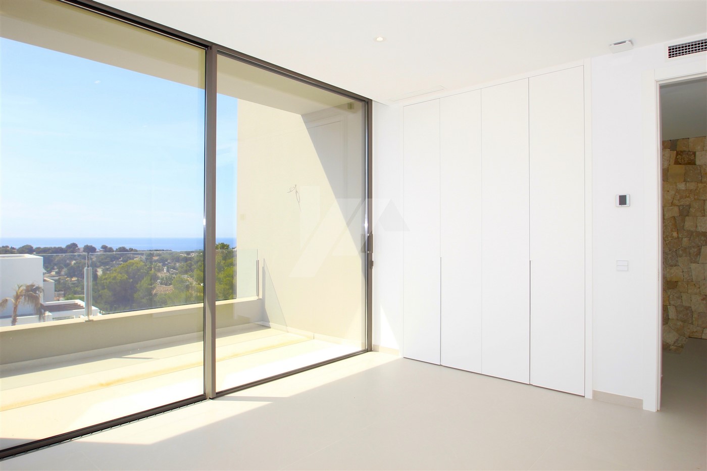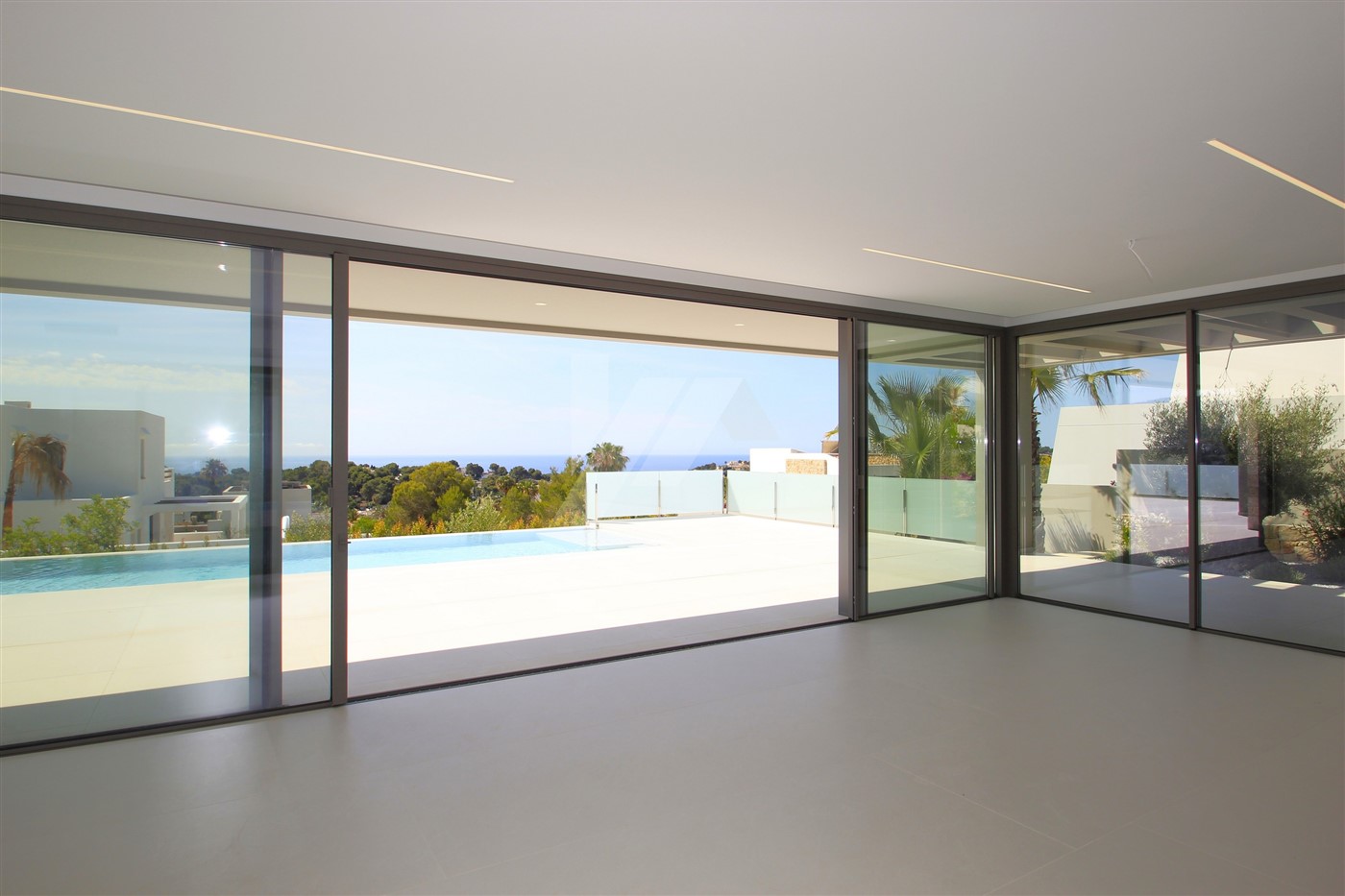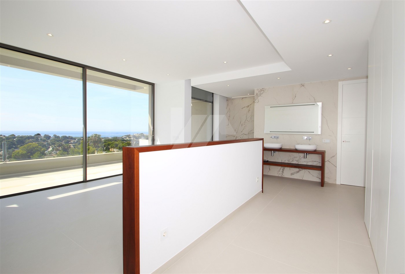 The imposing entrance door leads directly to the living room, the dining room and the open kitchen. Through large sliding doors, at the front and side of the house, you access a spacious terrace where we find the 4 x 10m infinity pool and a semi-covered area containing a summer kitchen. All windows at the back of the property have fully built-in, adjustable, electric blinds, as do all bathrooms. On this same level, there is also a guest toilet and a spacious bedroom with en-suite bathroom. The upper level consists of two double bedrooms sharing a bathroom and a large master bedroom with its own bathroom with shower and bathtub. There are good sea views from all bedrooms.