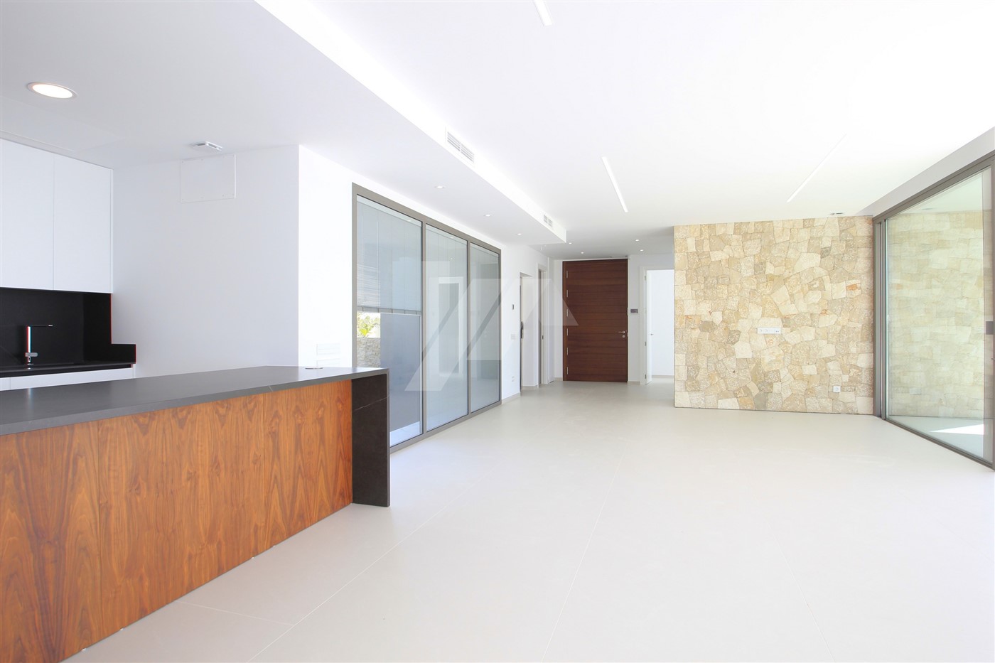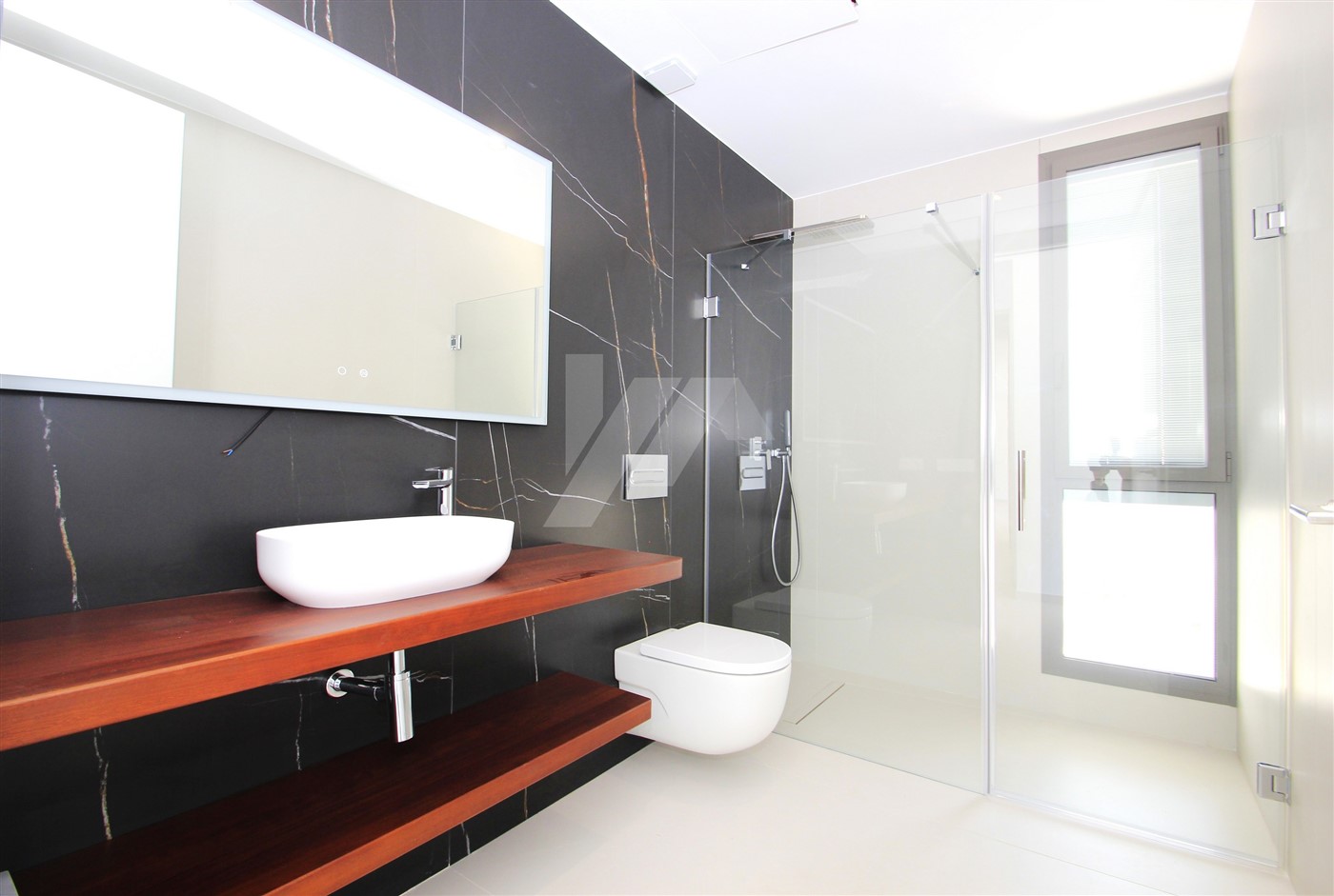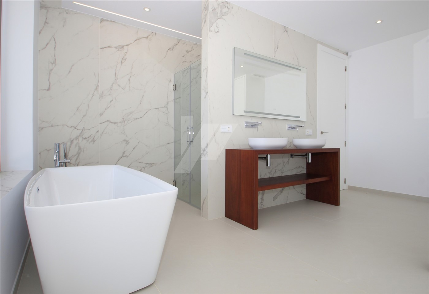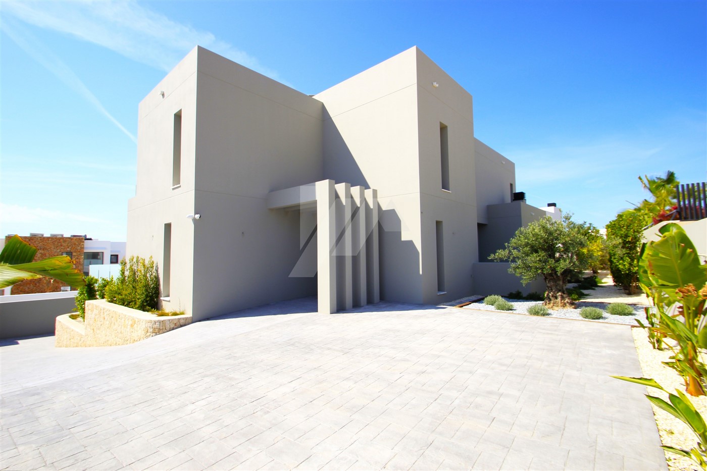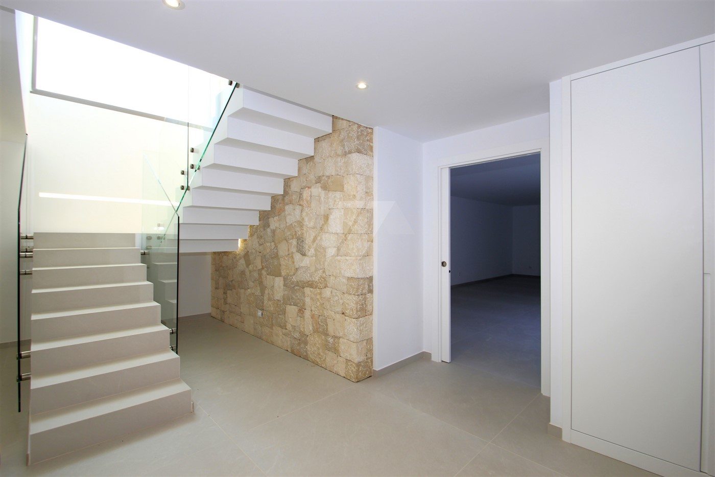 The imposing entrance door leads directly to the living room, the dining room and the open kitchen. Through large sliding doors, at the front and side of the house, you access a spacious terrace where we find the 4 x 10m infinity pool and a semi-covered area containing a summer kitchen. All windows at the back of the property have fully built-in, adjustable, electric blinds, as do all bathrooms. On this same level, there is also a guest toilet and a spacious bedroom with en-suite bathroom. The upper level consists of two double bedrooms sharing a bathroom and a large master bedroom with its own bathroom with shower and bathtub. There are good sea views from all bedrooms.