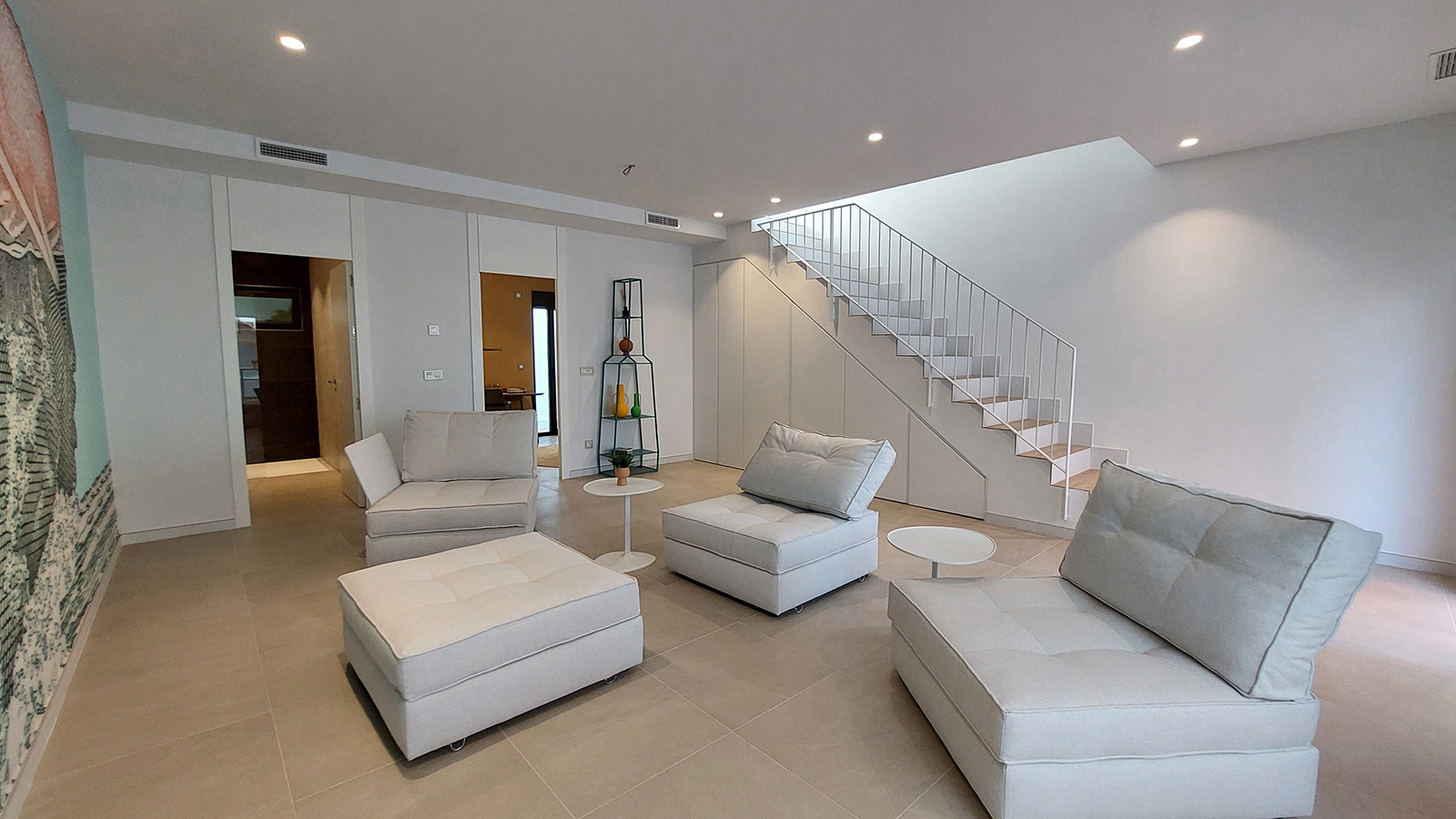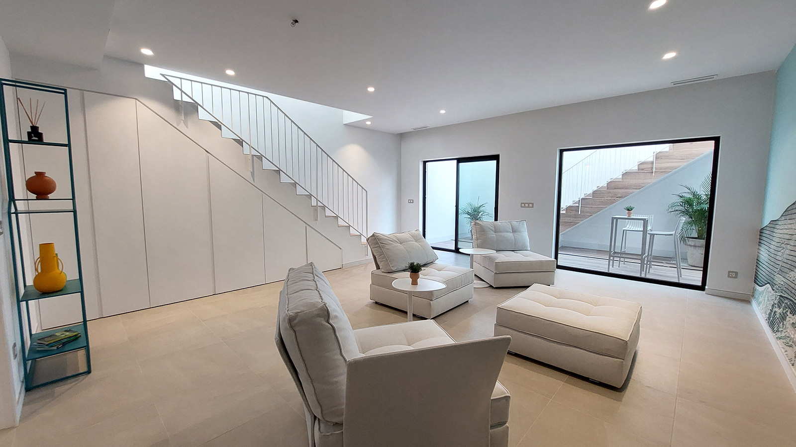 From the living room, and using the same stairs, we reach the basement, which is open plan (67.85m2) or can be divided into three spaces (as an extra): living room, bedroom and bathroom. This level has an English patio that provides natural light and vegetation, from which you can directly access the pool area through an external staircase.