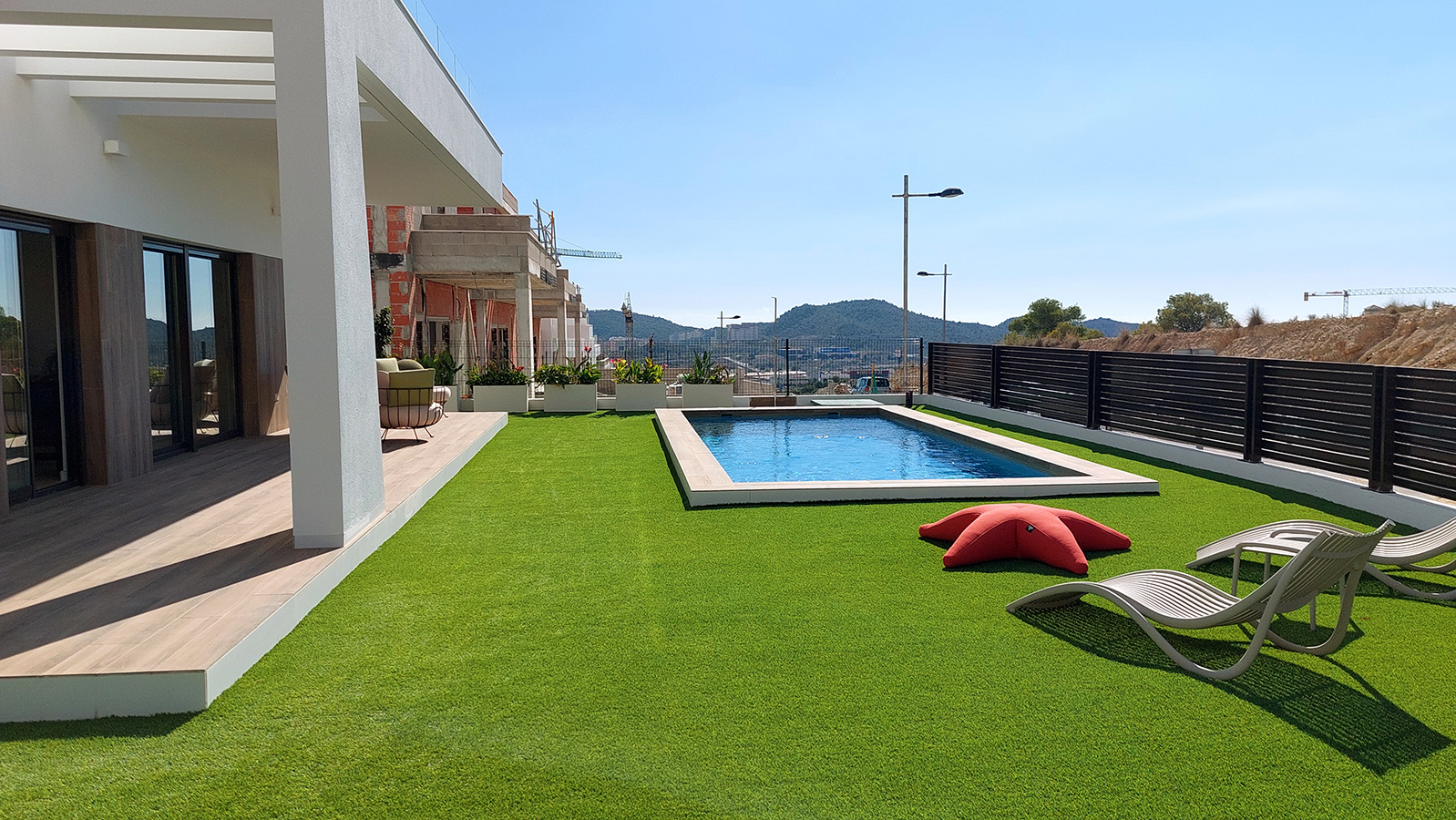 The exterior is made up of a garden with artificial grass that surrounds the house, a semi-covered terrace, a 26.40m2 pool and a parking area for cars with an electric gate. The plots are 300m2, except for the one that appears in the photos of this advertisement which is 400m2, since it is the one on the corner (having a higher price not yet offered by the developer).