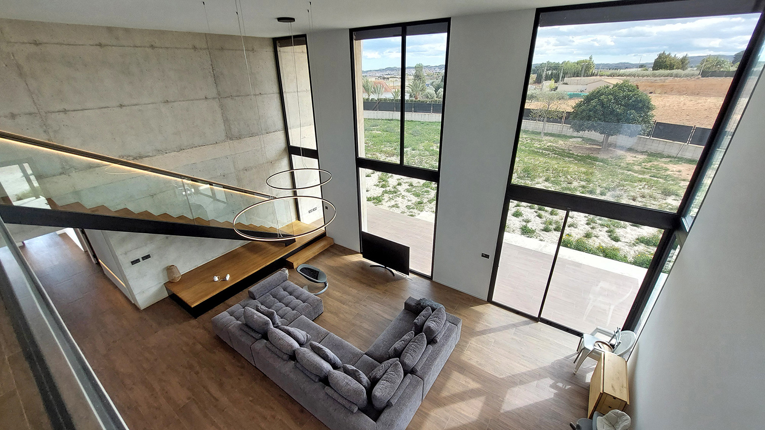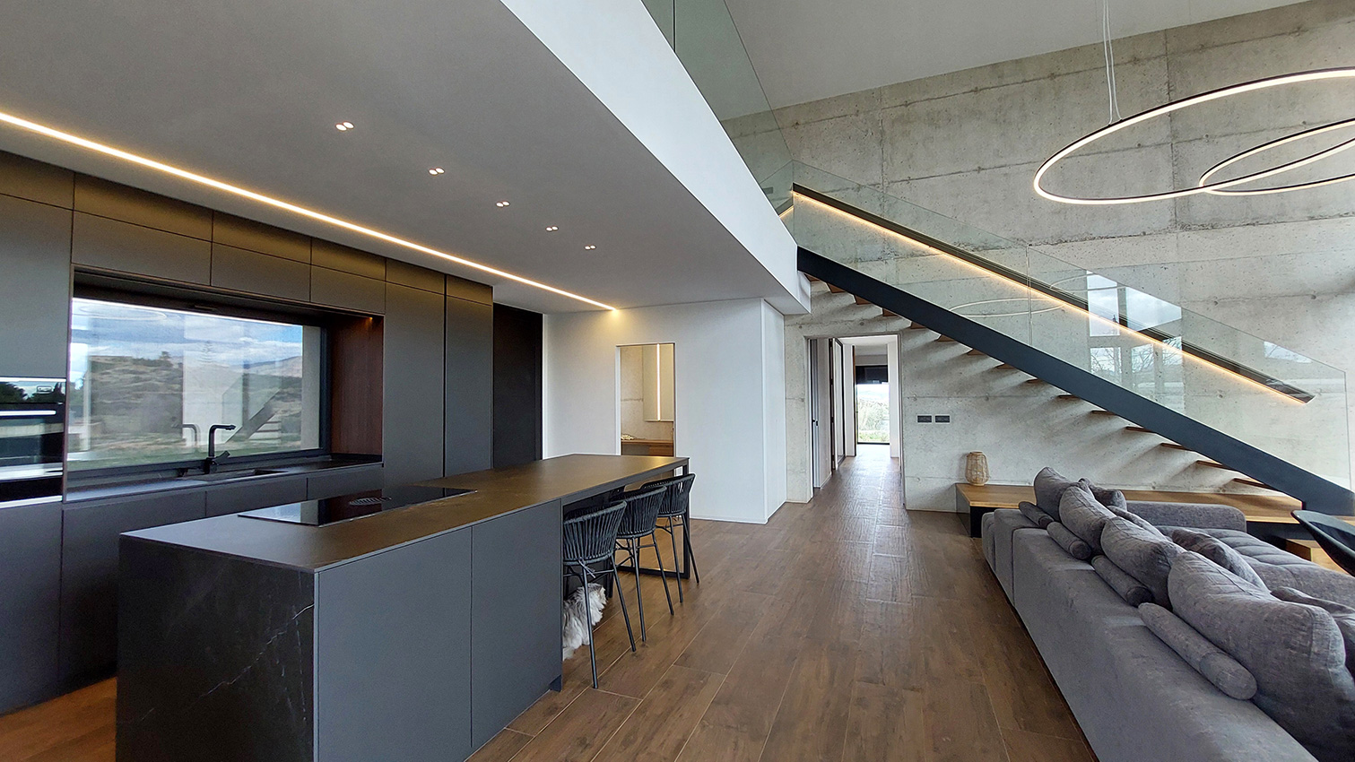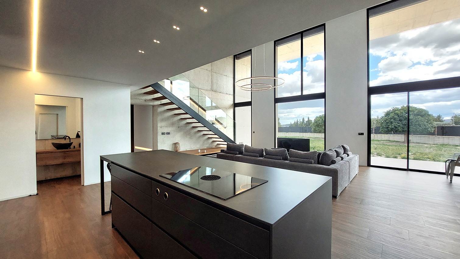The house has a constructed area of 203 m2, with a living area of 195 m2, the vast majority of which are distributed on the ground floor. On this level, we find a spacious living-dining room with 7-meter high ceilings and enormous floor-to-ceiling windows that visually connect the outdoors with the interior. The kitchen is designed with custom-made cabinetry and island countertop, and is fully equipped with integrated high-quality appliances. An interior staircase anchored to the concrete wall leads to a space located high above the living room, currently used as a storage area, but originally intended as an office, extra bedroom, gym or secondary living room.
