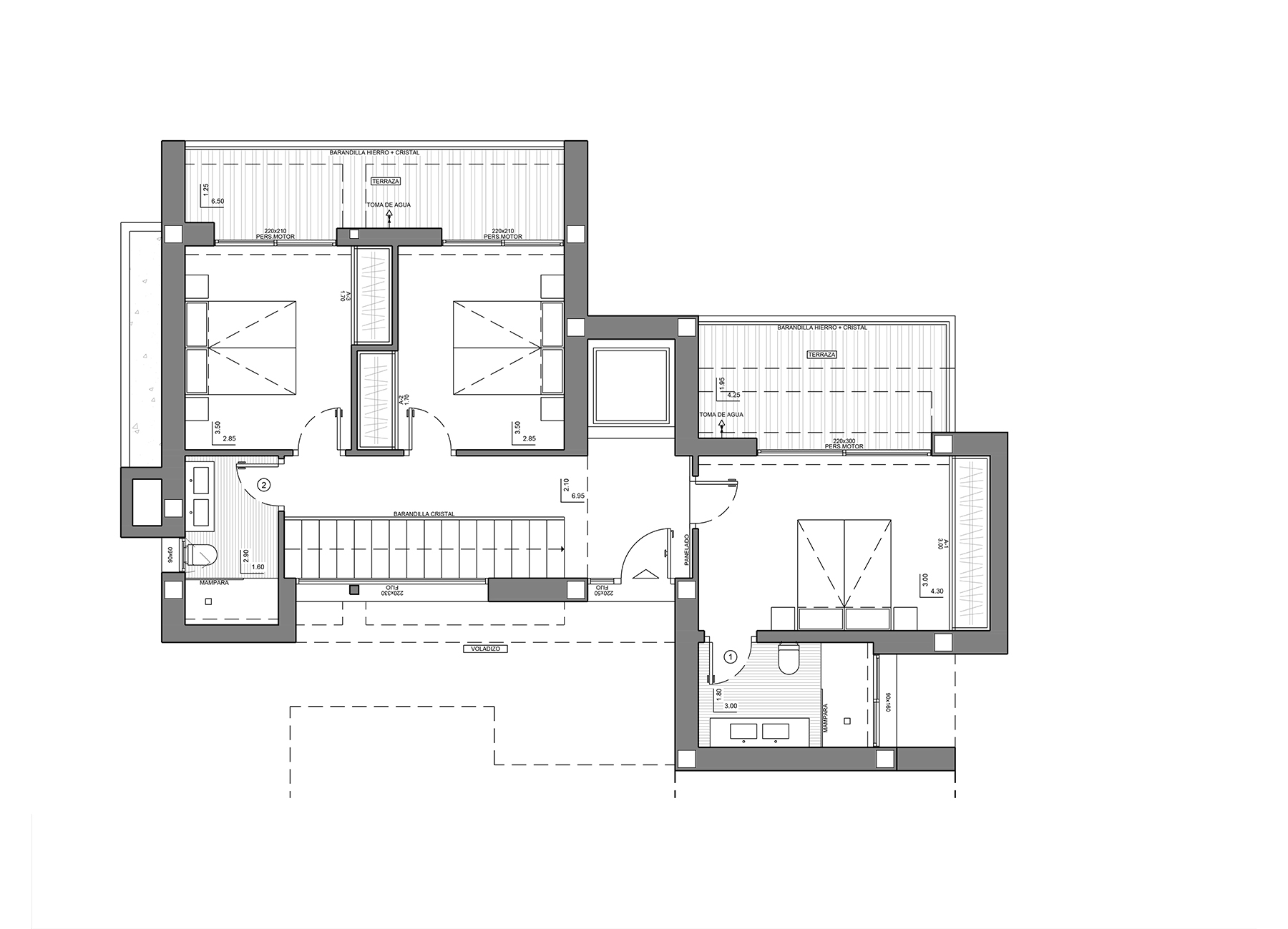 The luxury villa with garden and private pool is distributed over three floors, with the access located on the upper floor, where we have the parking lot and the elevator that connects the entire house. The three bedrooms are located on the middle floor, all with access to a terrace to breathe fresh air and start the day watching the Mediterranean.