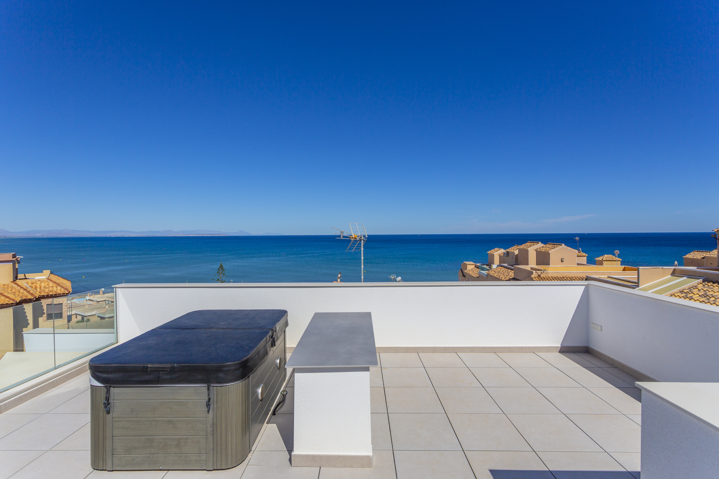 Access to the rooftop solarium is via spiral stairs, which in this case have a wide tread to be more comfortable to use. On this level we find a jacuzzi and enjoy panoramic sea views, being able to see the entire La Mata beach and even Benidorm on clear days.