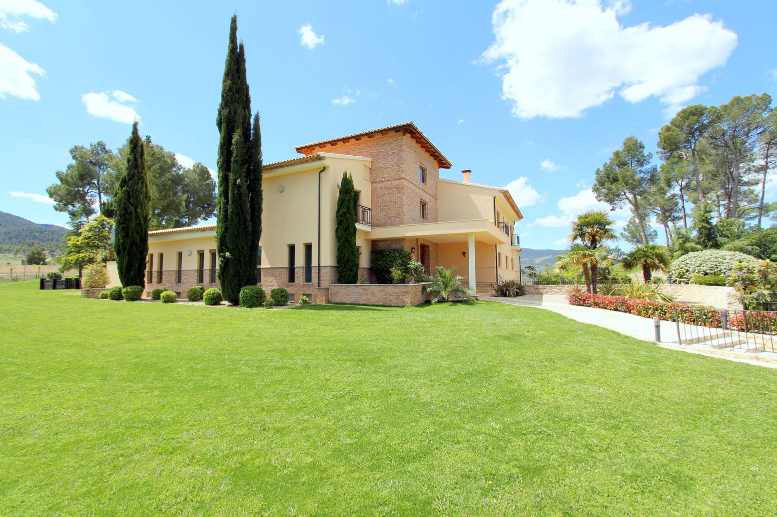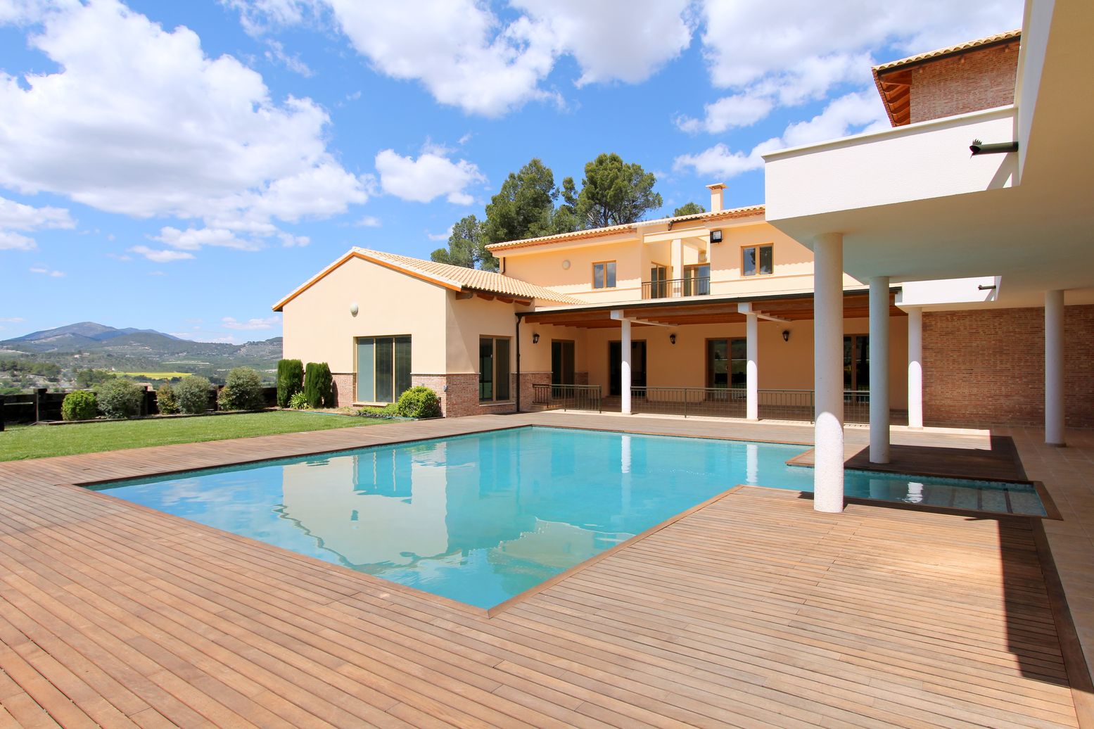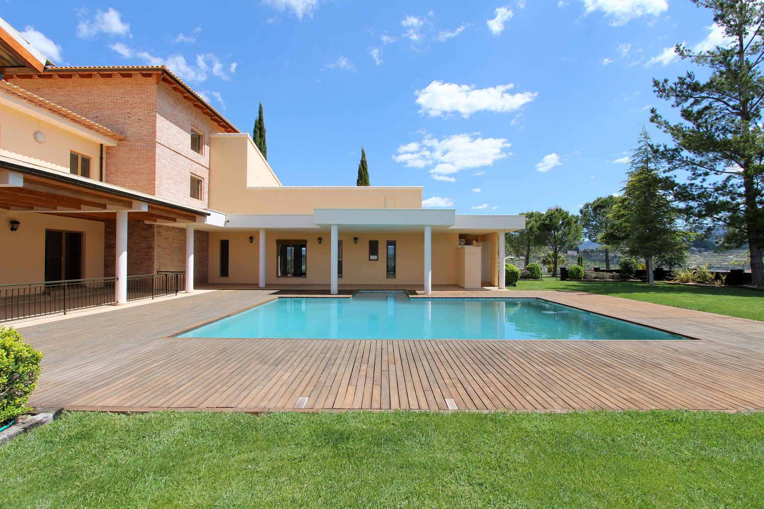 Outside, in the fenced area, we find a lush garden with trees and natural grass, a tennis court, a comfortable pool area with a wooden terrace and many attractive outdoor spaces ideal for relaxation. The cultivation area is a large land with certified organic olive and almond plantations, with a production of 14,000kg and 5,000kg respectively per harvest. In this area there is a large pond of drinking water with a capacity of 2 million liters and a drip irrigation system for the entire farm.