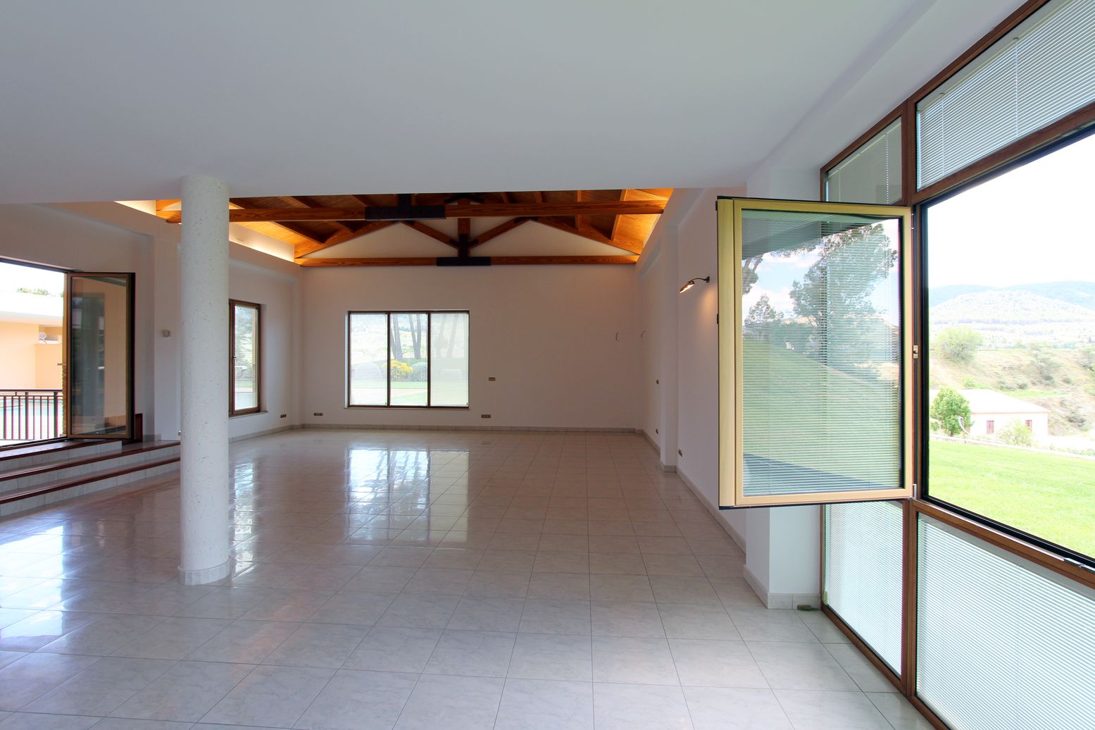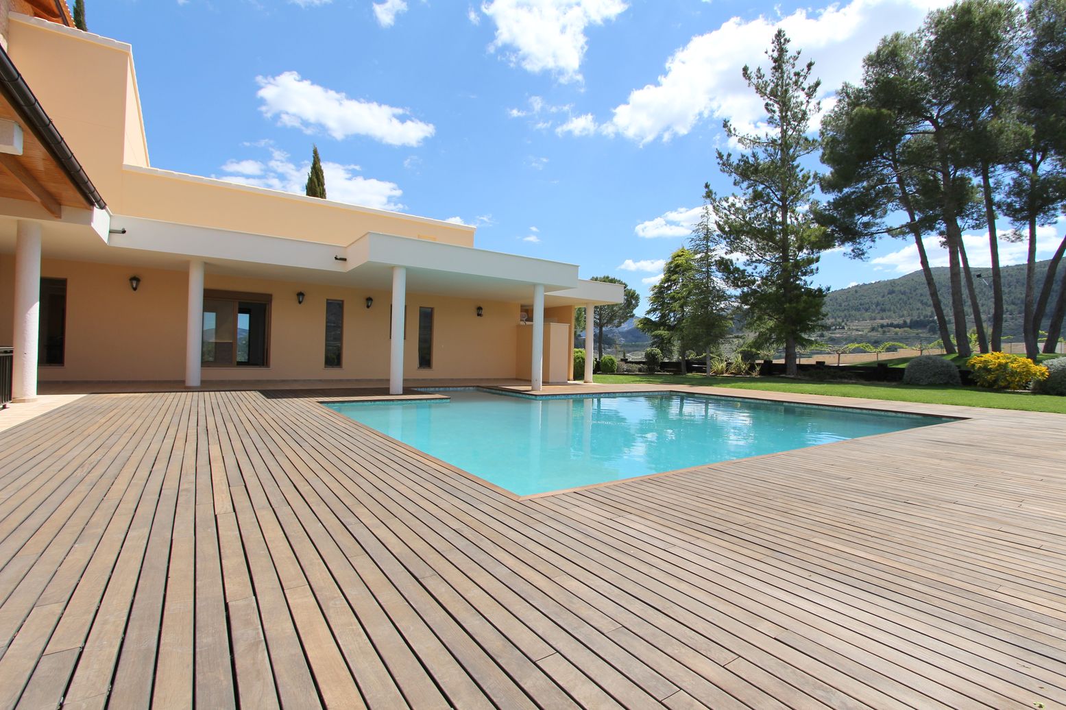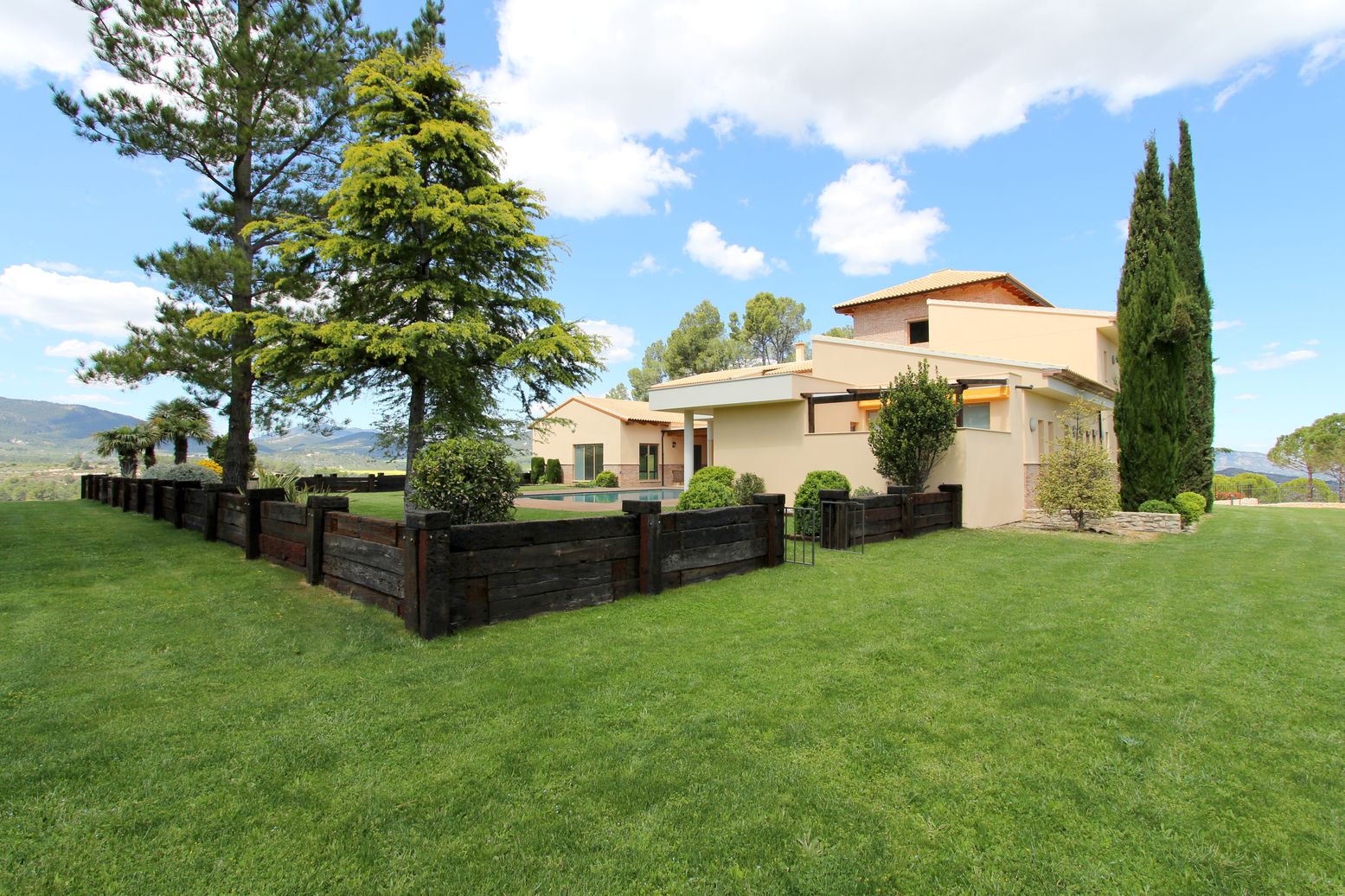 Outside, in the fenced area, we find a lush garden with trees and natural grass, a tennis court, a comfortable pool area with a wooden terrace and many attractive outdoor spaces ideal for relaxation. The cultivation area is a large land with certified organic olive and almond plantations, with a production of 14,000kg and 5,000kg respectively per harvest. In this area there is a large pond of drinking water with a capacity of 2 million liters and a drip irrigation system for the entire farm.