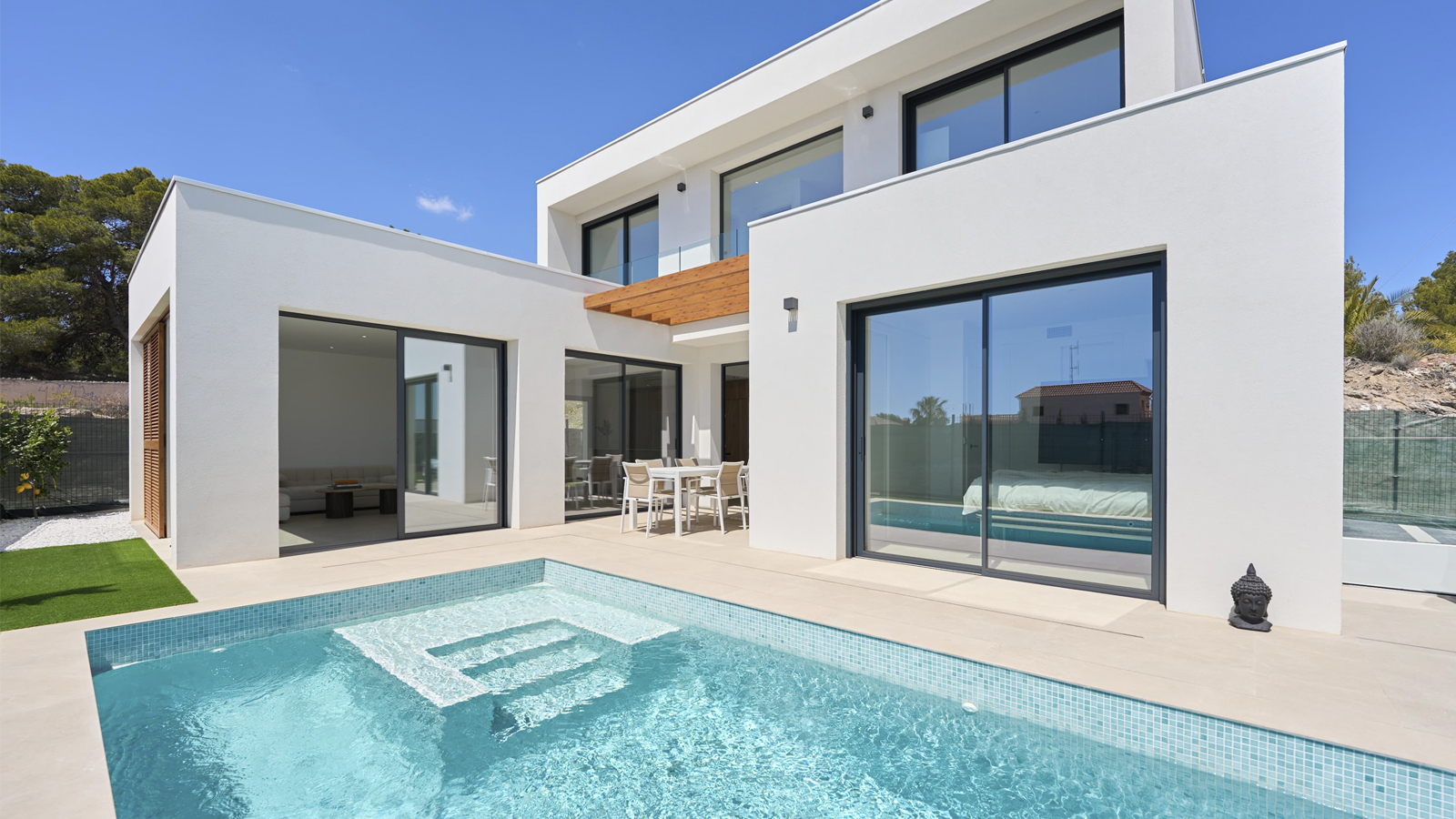 This is a quiet residential complex, located in a countryside area, but only 5km from the beach of El Albir and 2km from the centre of Alfaz del Pi. Its construction is based on bioclimatic architecture, with a double A rating in the energy certificate, which can provide savings of up to 70% in electricity consumption. In addition, the houses are equipped with solar panels and face south, favouring sustainability and energy autonomy. Its wooden cladding offers greater thermal and acoustic insulation, while maintaining the quality of the air inside the house. The materials used in its manufacture are of high quality, durable and resistant to fire and humidity.