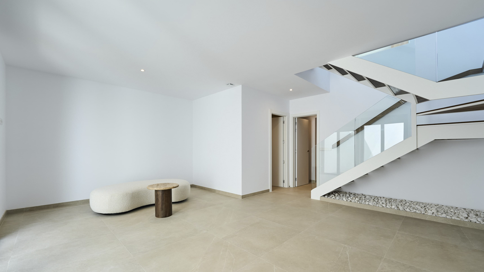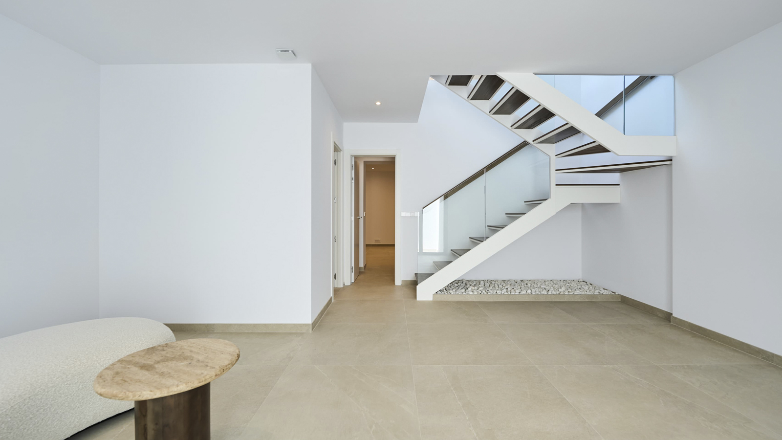 The villas are independent and have their own pool and garden. They have a constructed area of 233 m2 which is distributed over two floors, as follows: On the ground floor, a large living-dining room connected to the open-plan kitchen, the master bedroom with its own bathroom and direct access to the pool area, a guest toilet and a 26 m2 terrace. On the top floor, there are two double bedrooms, a bathroom and a 5.65 m2 terrace. From this level, the houses offer beautiful views of the sea and the mountains. There is the optional possibility of developing a basement with an area of 47.26 m2.